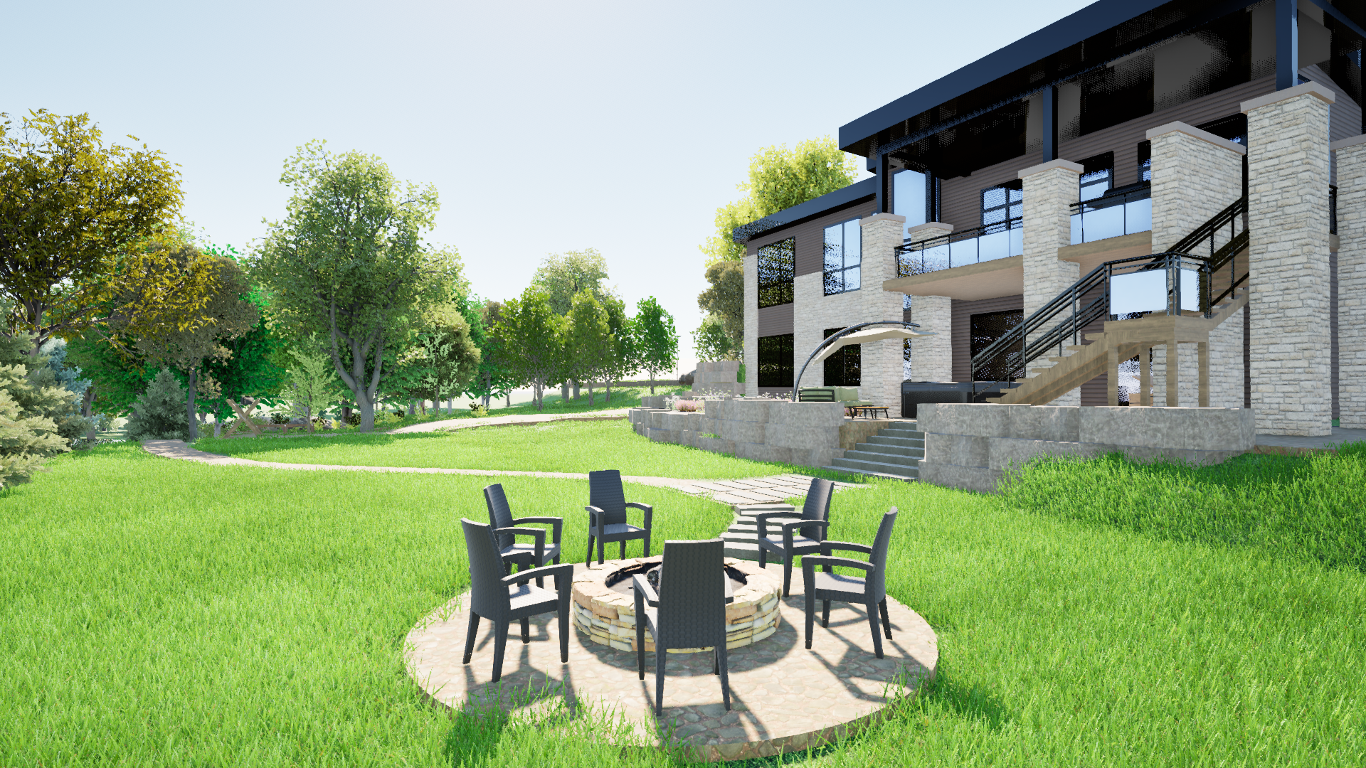change brick style to modern gray design put horizontal wood siding brown everywhere where there is no bricks soffit fascia windows and doors color black add glass railings to the stairs on the right and where the rocks are high of the left side of the house add a firepit with chairs change chairs models for adirondak wood in the front of the house with rock pathway with lights all the way and native flowers low maintenance