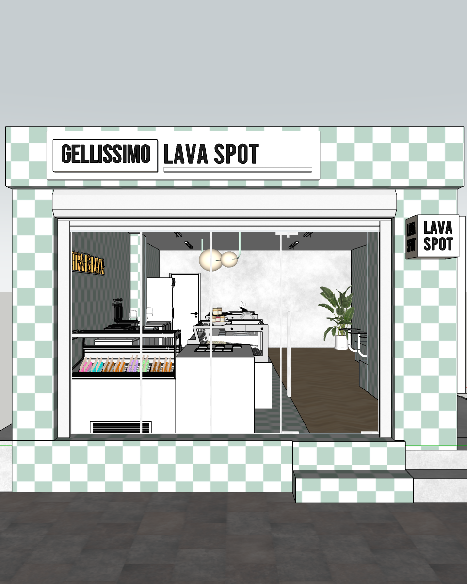 render it with these materials do not add anything extend the building upward add the upper floors directly above the store aligned exactly above it not set back all upper floors must be white facade while only the store level keeps the checkerboard tile material