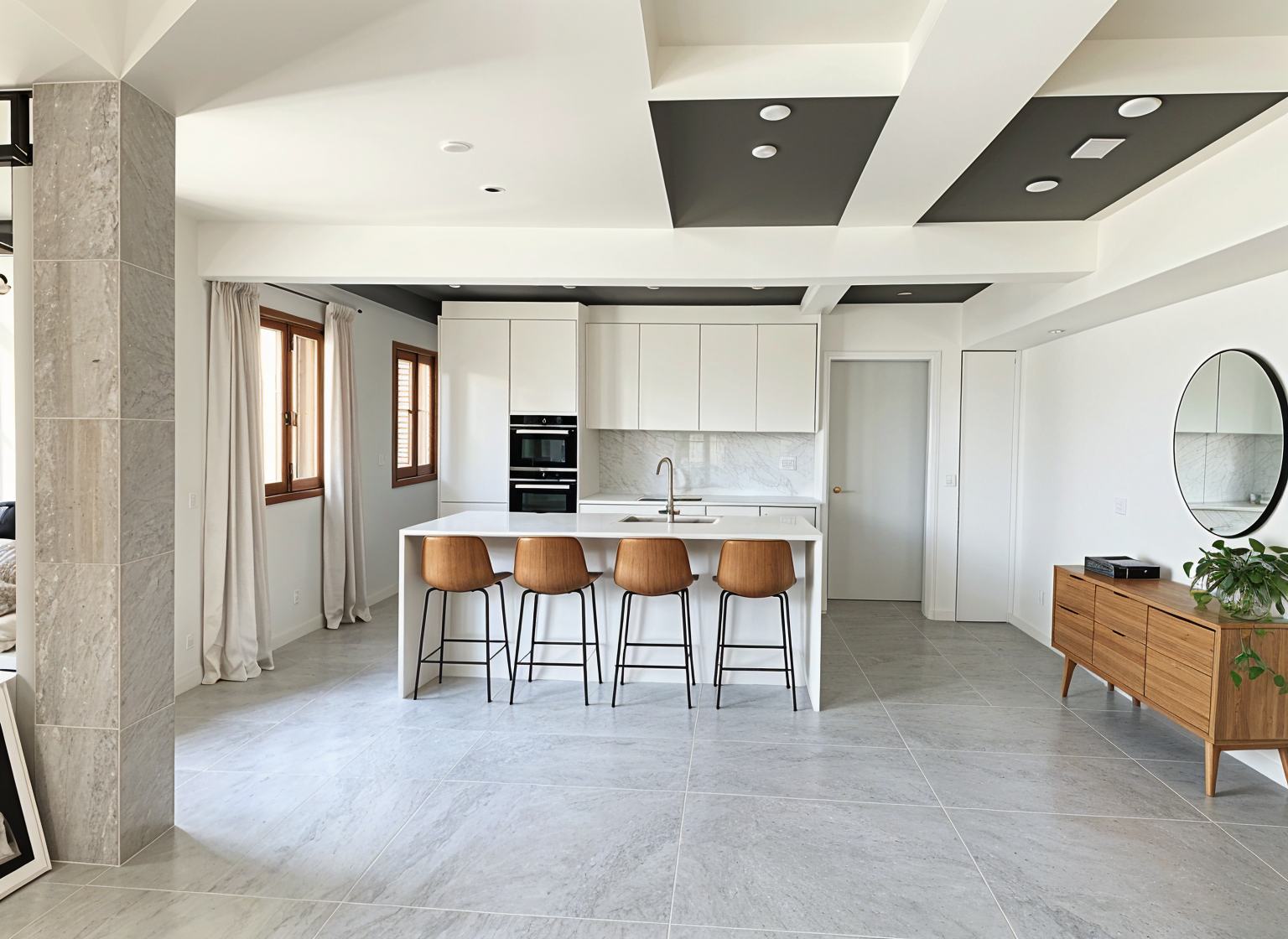 futuristic design replace the chandeliers so that both are the same keep the same floor paint it white