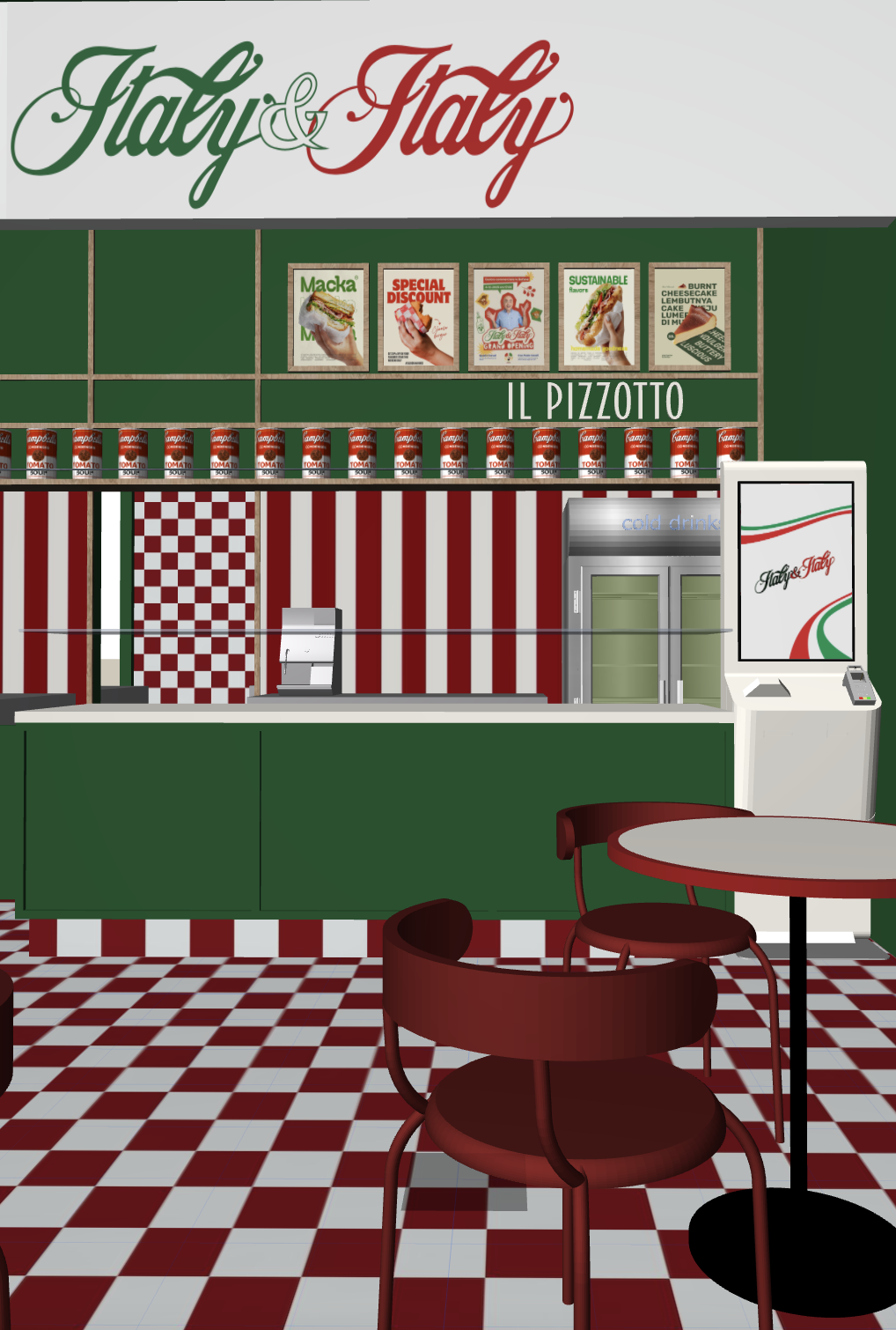 retro themed italian deli interior featuring a vibrant color palette use deep green for the walls creating a cozy atmosphere display a series of vintage style posters on the wall with muted tones arrange a row of campbell s tomato soup cans with classic red and white labels on a wooden shelf include a striped awning with bold red and white stripes capture a mid century modern aesthetic with a slightly warm ambient lighting to evoke a welcoming feel add lighting