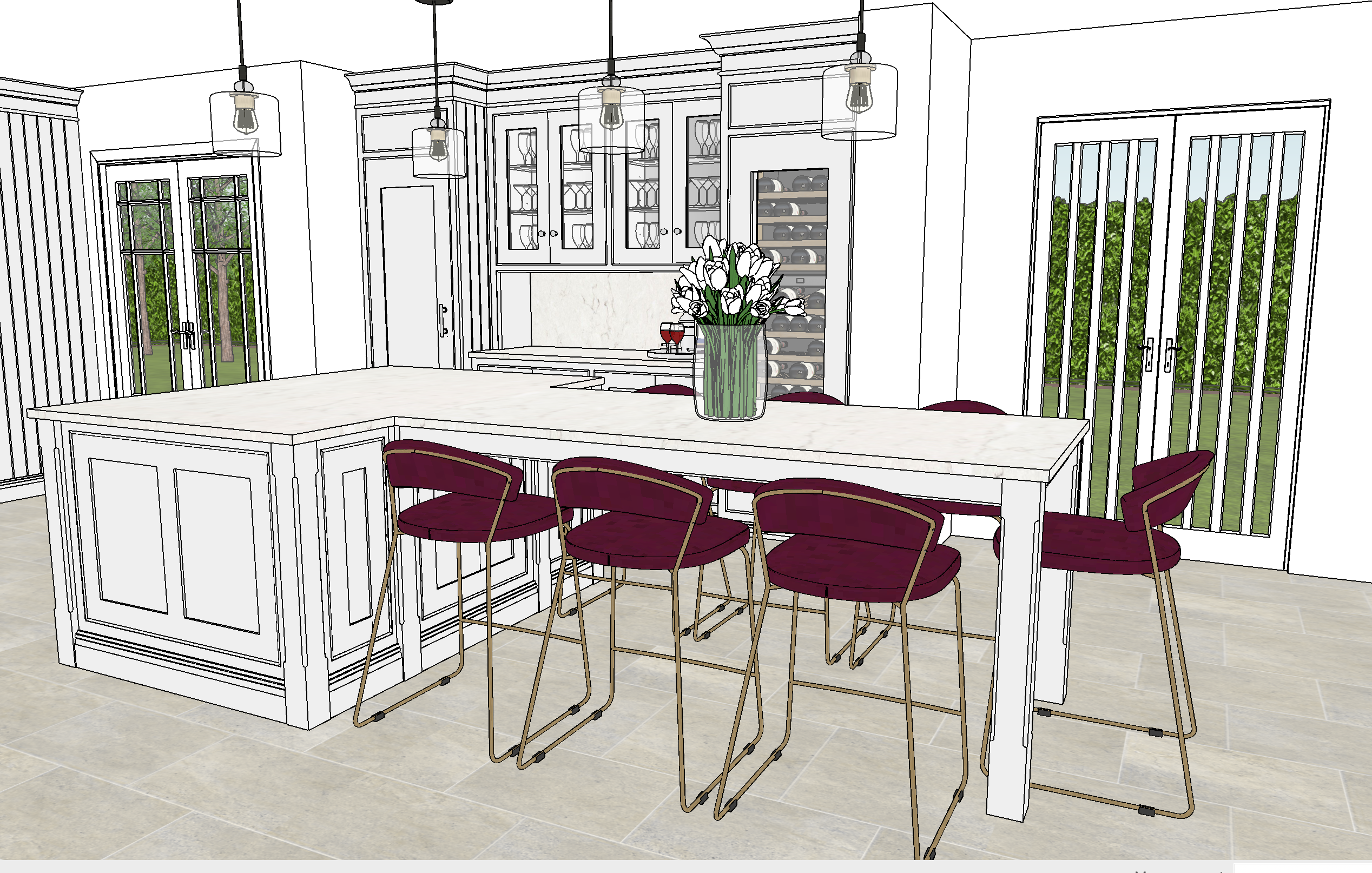 make realistic dress as glamour bar area with drinks and alcohol show hallways through left hand glass doors