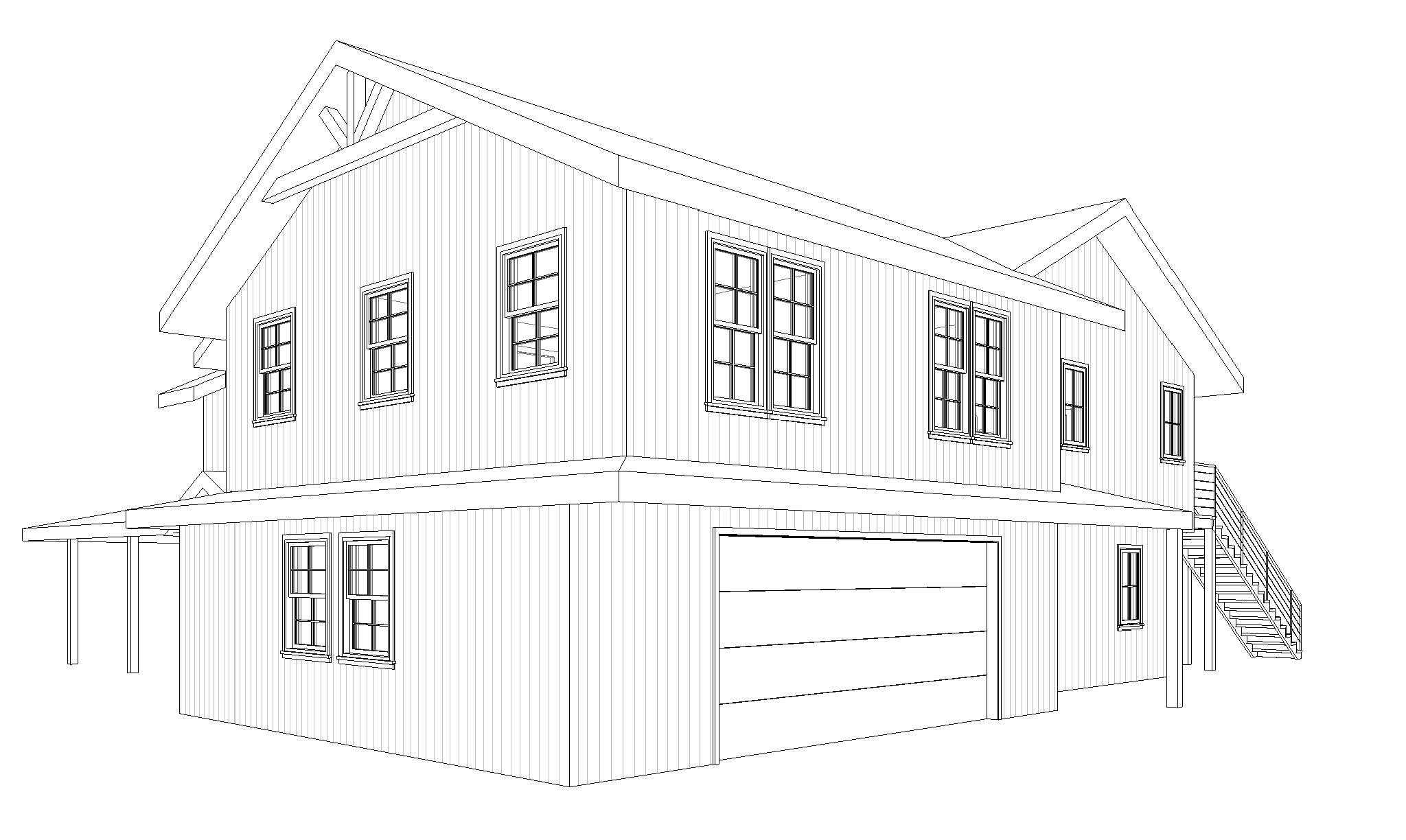 a farmhouse style house in a country setting filled with oak trees and flowers white board and batten siding gray stone accents warm wood columns and trusses a black standing seam metal roof on the lower roof a black asphalt shingle roof on the upper roof a warm wood garage door wood staircase with black cable railing and black windows no change to structure
