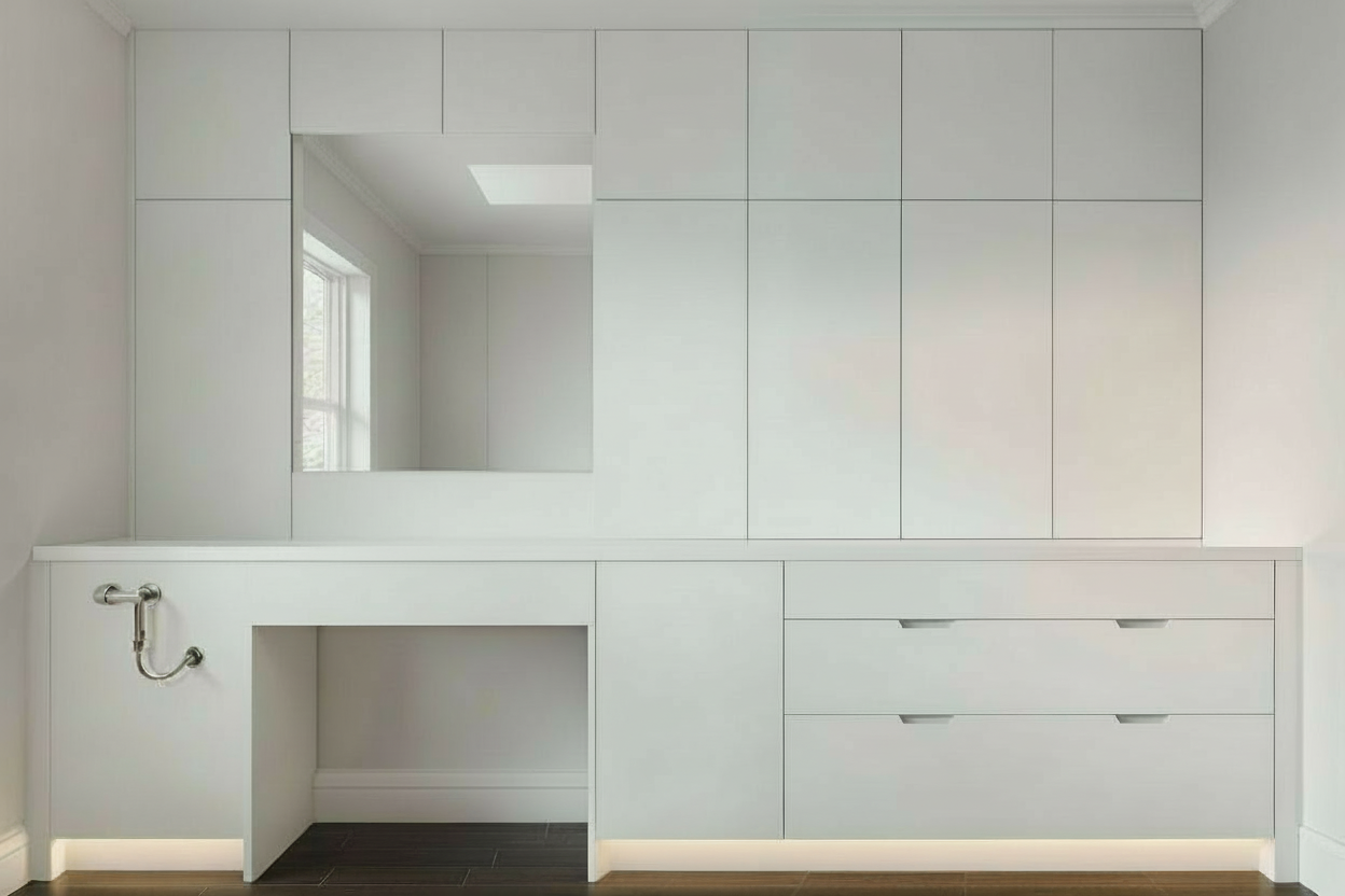 add three drawer base cabinets to the left and right of the open space