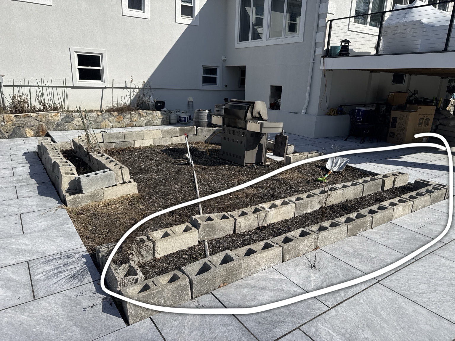 can you give me an outdoor kitchen with a pergola the area is 21 x 16 the circles area will be a island for seat and the area where the blocks are would be the back of the ktichen which would consist of a standard 42 grill and argentian grill and a pizza oven and to also be covers wiuth a louvered pergola above stone veneer finish with a porcelain countertops