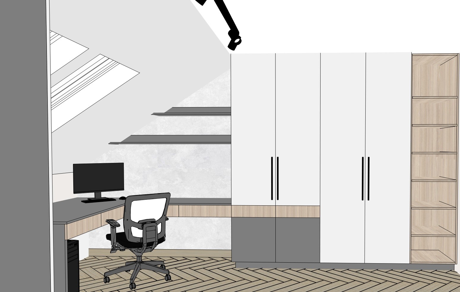 image to photorealistic render the desk is grey not concrete the wall with the concrete effect is lighter the daylight is cooler there are led strips under the shelves above the desk the main light is also on