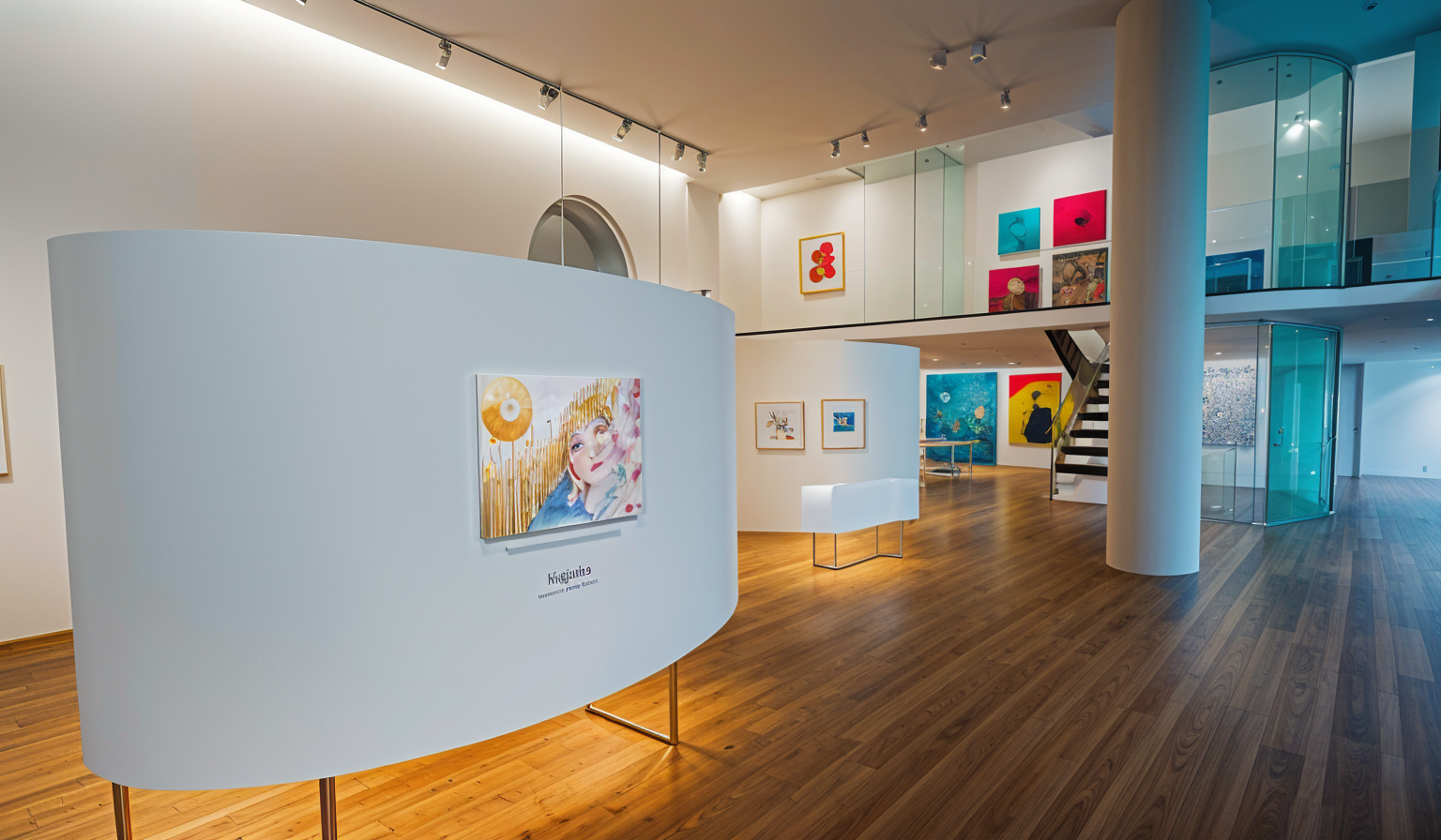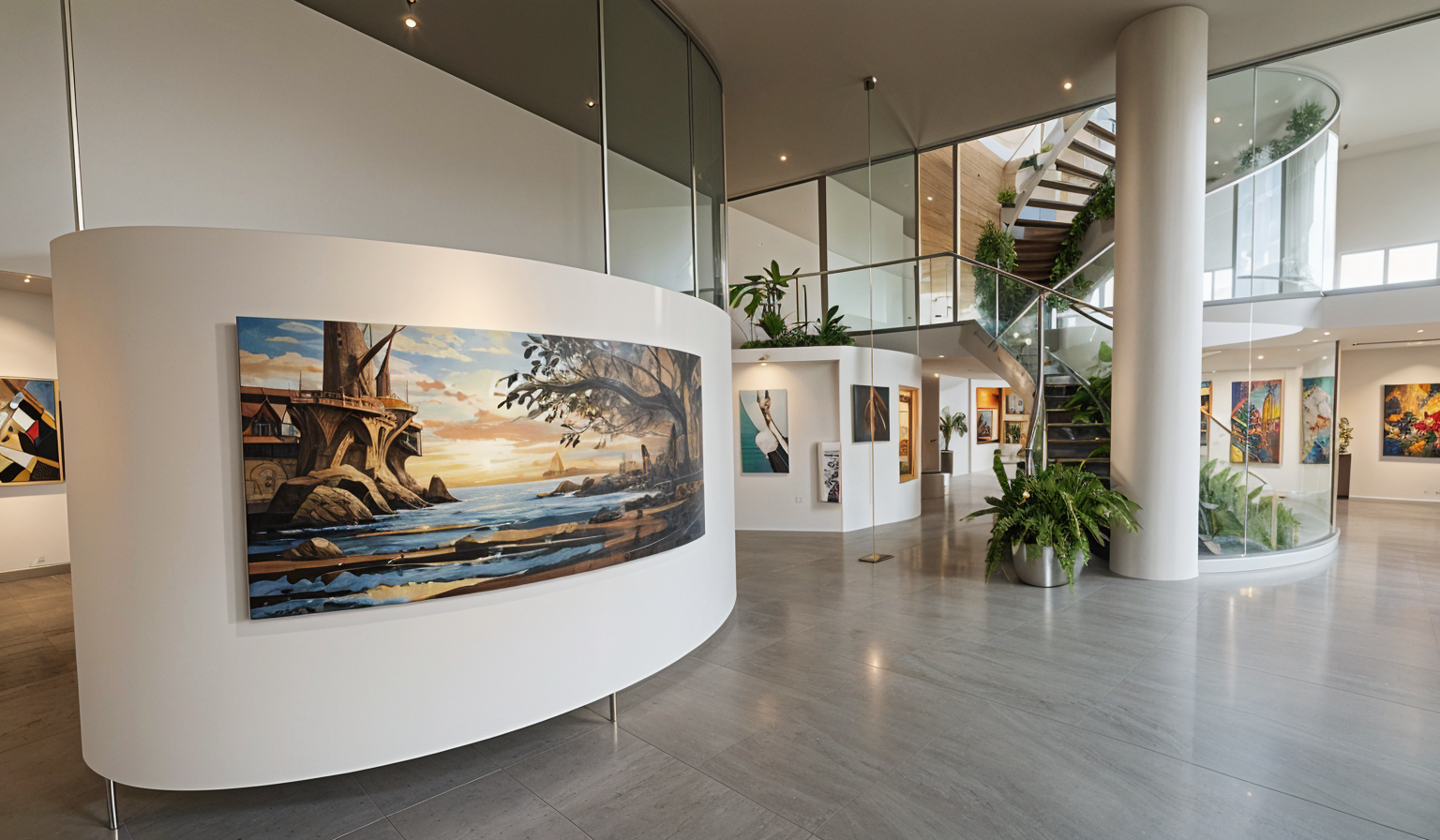 render a modern art gallerie with lots of colors on the wall and high quality materials like collored stone and light wood a lush round staircase with an elevator with different levels and some display of art and sculpture around the gallery
