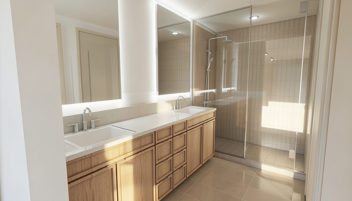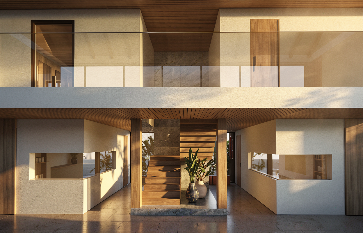 recompose the existing fa ade windows by combining vertical accent windows with wider horizontal openings maintain general window locations but adjust proportions for a more intentional architectural rhythm enlarging select horizontal windows for contrast preserve concrete texture brick volume and black framing element achieve a balanced modern industrial fa ade with refined proportions improved natural light and cohesive composition high quality architectural visualization