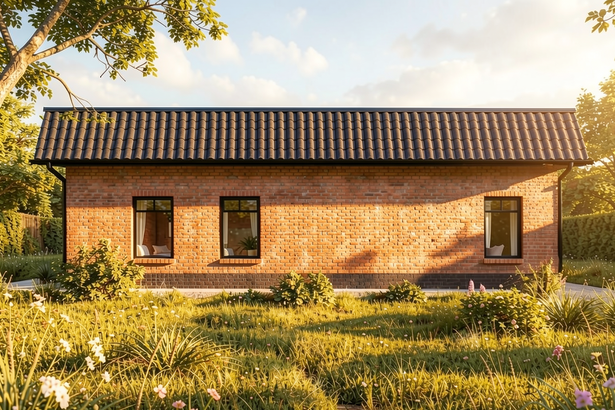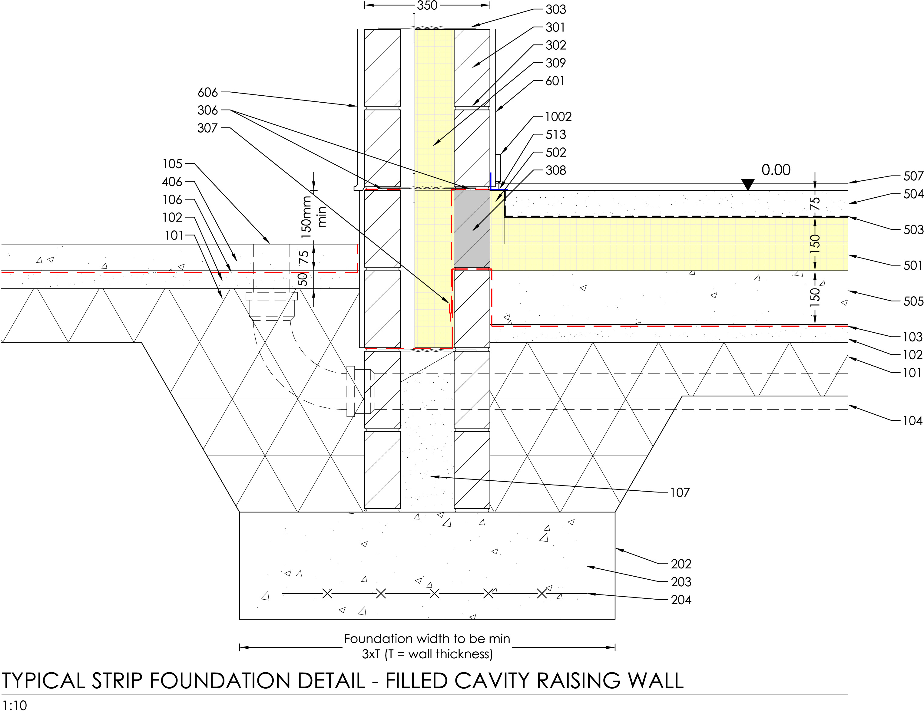 create a detailed architectural rendering showcasing a typical strip foundation detail with a filled cavity raising wall use a neutral modern palette with soft gray gradients for the concrete elements highlight the insulation layers with a gentle pastel yellow to indicate the material s importance accentuate structural lines with crisp black for clarity and precision add red for key lines and indicators to emphasize structural intersections set the atmosphere to be clean and precise reflecting an architectural technical drawing style while maintaining a sense of calm and focus through smooth elegant shading and crisp lines
