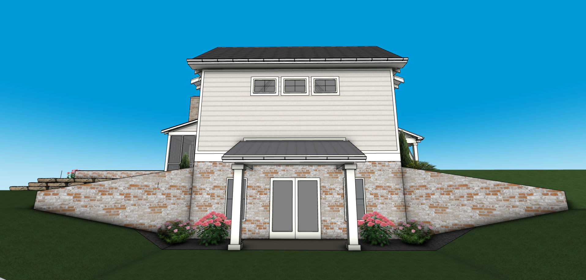 render a charming house with crisp white siding and dark gray shingles on the roof the lower walkout basement level features rustic light stone brick highlight the lush green lawn and vibrant pink flowers in the garden the atmosphere is serene and welcoming under a bright blue sky with soft shadows enhancing the elegant architectural details