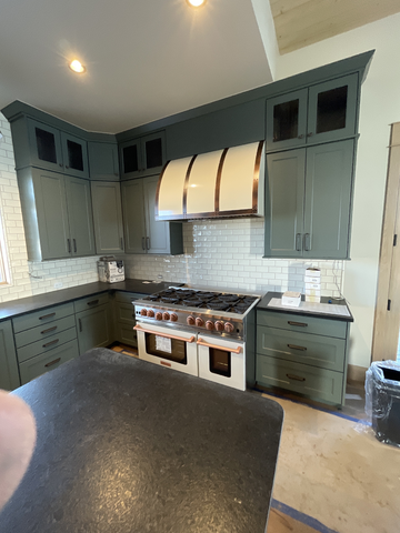 do not change the cabinets in any way preserve the exact cabinet colors materials finishes dimensions door and drawer styles hardware spacing alignment and all geometry exactly as shown do not alter the countertop shape backsplash appliances flooring lighting fixtures or wall structure only remove the construction materials clutter and mess from the scene clean the room and make it look finished and staged add a few simple tasteful home accessories appropriate for the style of the space but do not add or remove any furniture windows or architectural elements maintain the original lighting direction and realism enhance clarity and polish the photo while keeping the cabinetry and room design completely unchanged do not alter the lighting to keep the cabinet colors as they are in the image remove the black island and finger make the range sit straight flush with the cabinets