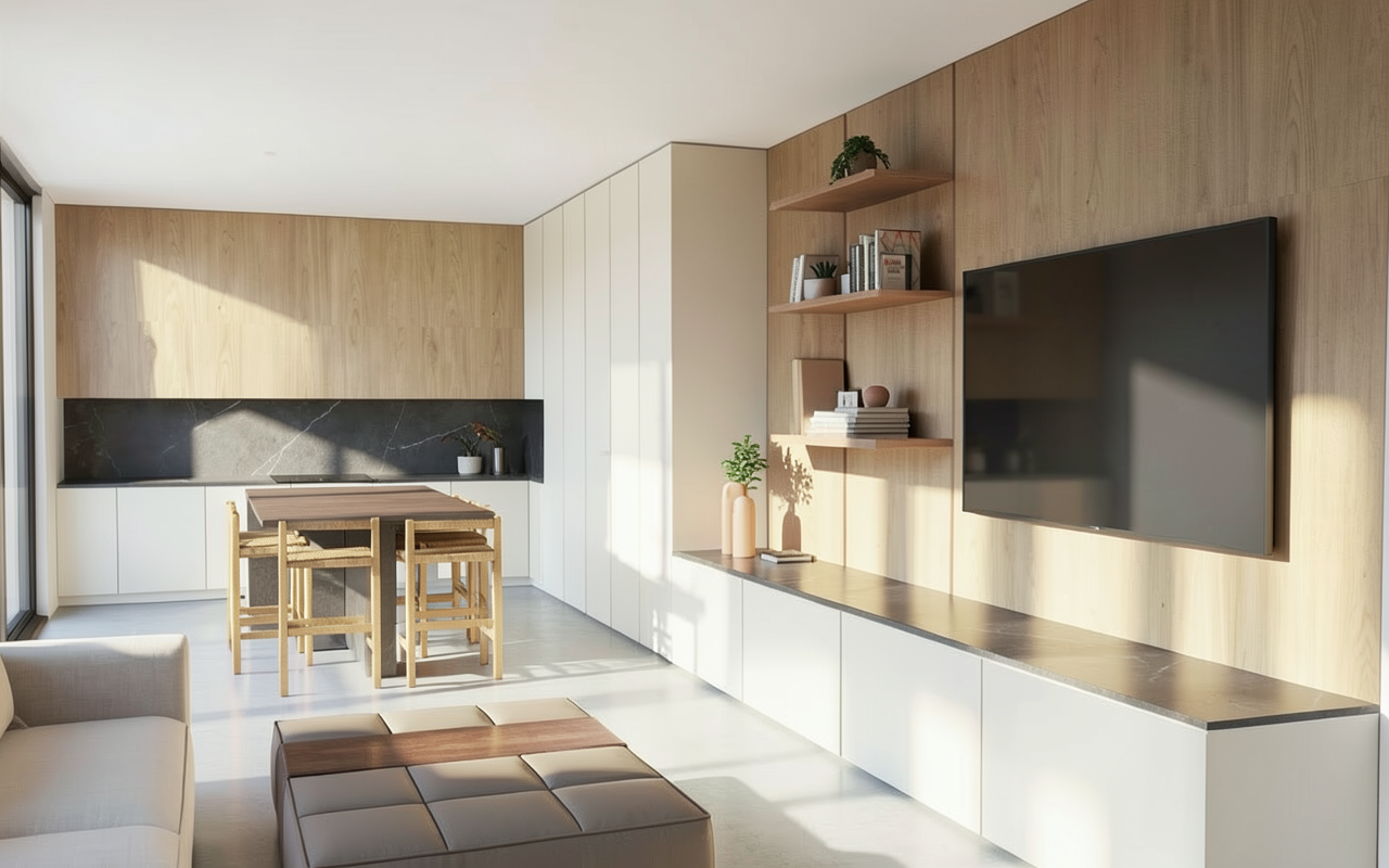a serene suburban scene capturing a minimalist contemporary single story house with a creamy white exterior and dark gray roof shingles the garage door is a warm polished wood tone dark bronze modern window frames and new creative ideas to evoke contemporary minimalist design