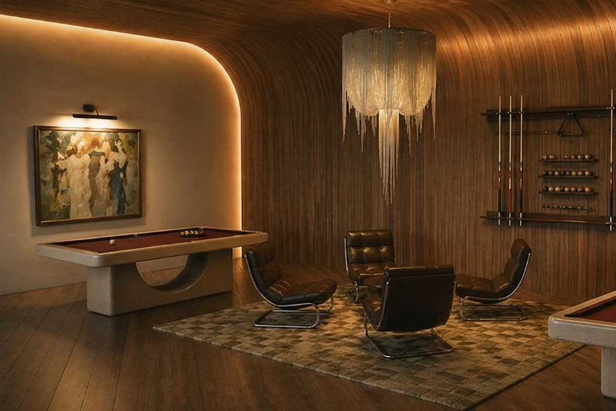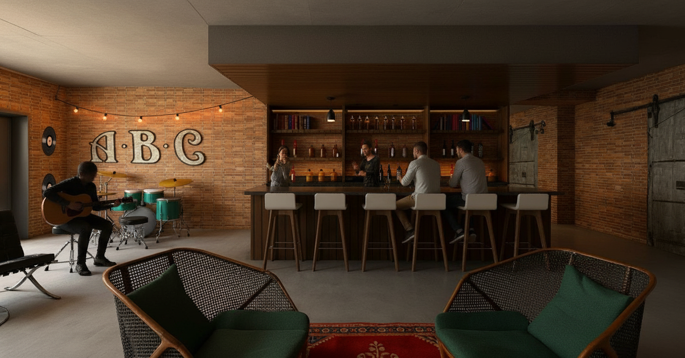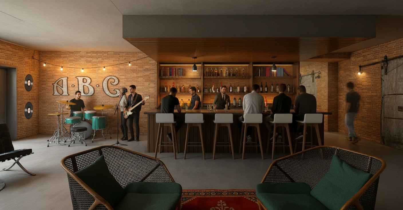 lshaped couch facing three chairs bar in top right corner with two sofas on either side