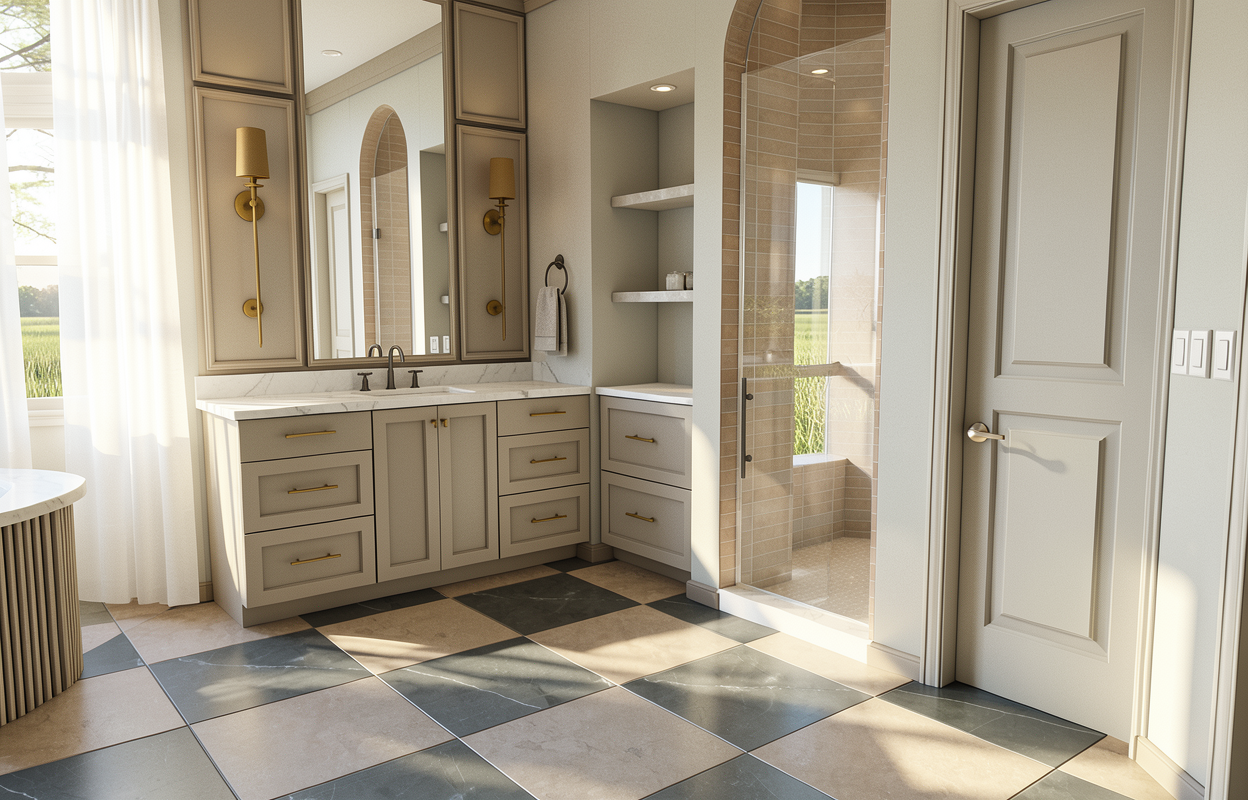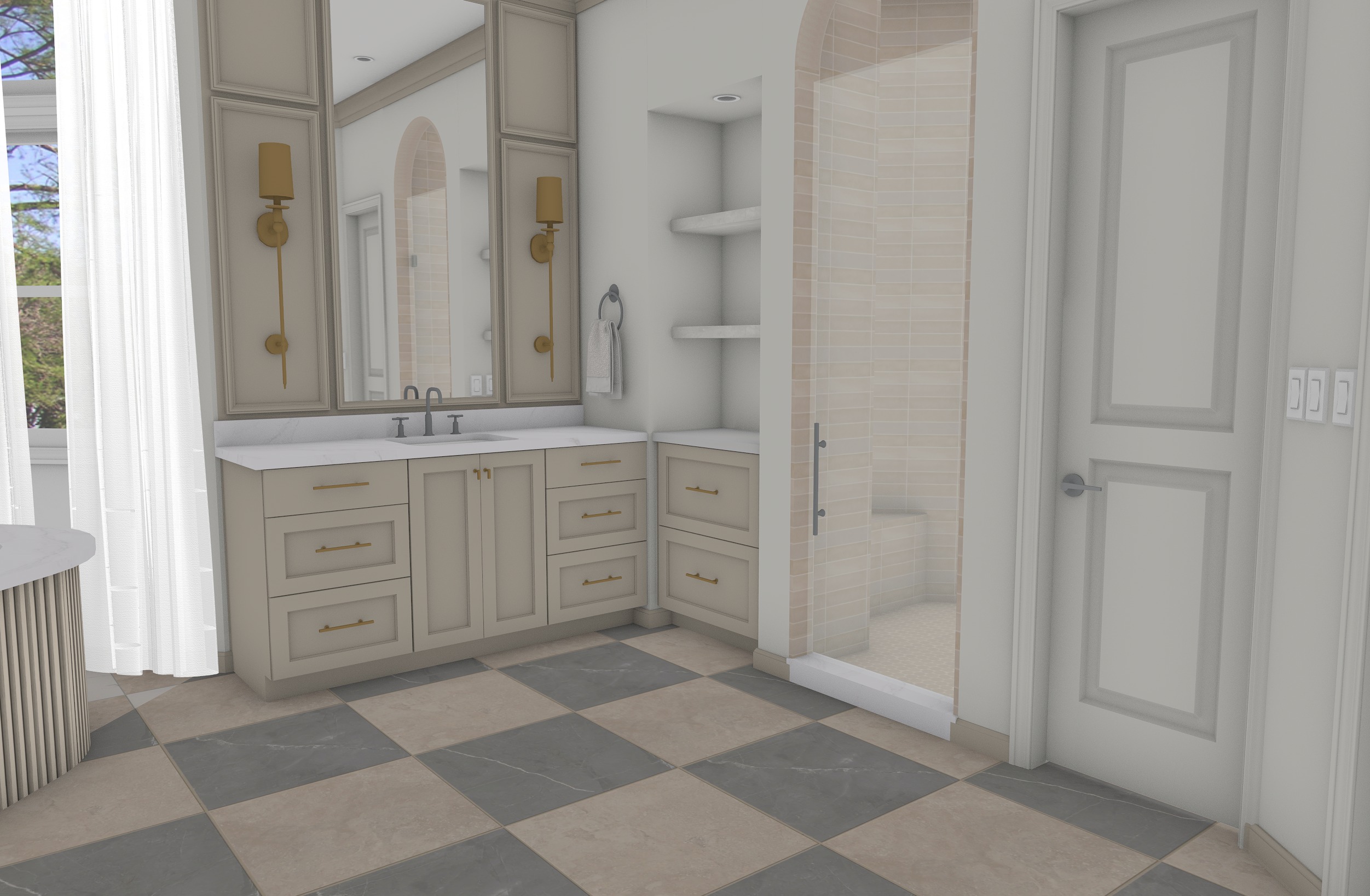 maintain all geometry create a hyper realistic interior rendering at midday this is a first floor room the windows are overlooking a marsh scene the lighting color is 2700k the cabinetry is a pale warm gray the right side has a show door keep the reflective aspect low there is no window in the shower behind the door the sconces have white linen shades