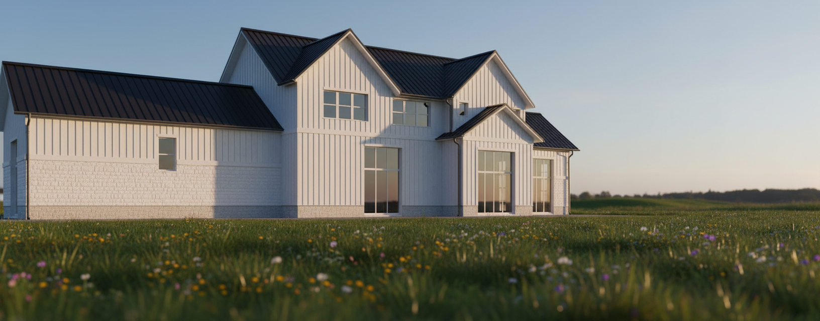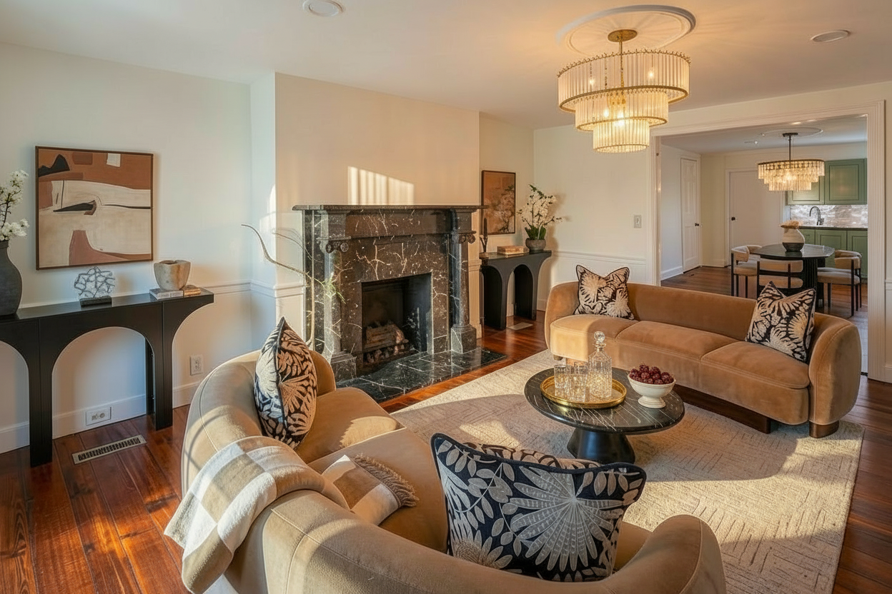 late evening light outside the windows add light from the recessed lights add some accessories and books on the shelves at the left side of the view add a woman standing at the sink in the kitchen add a man sitting on a middle stool at the counter add some appetizers wine glasses and a bottle of red wine on the counter make the light level in the kitchen a little lower and warmer in color show the white calcutta same material on the wall of the kitchen as the counter add light from the recessed lights add some appetizers wine glasses and a bottle of red wine on the counter make the light level in the kitchen a little lower and warmer in color keep the shoes in the cabinet in the source image the upper cabinets in the kitchen are white make the entry door glass translucent all of the walls and ceilings are painted white do not add any windows to the rendering