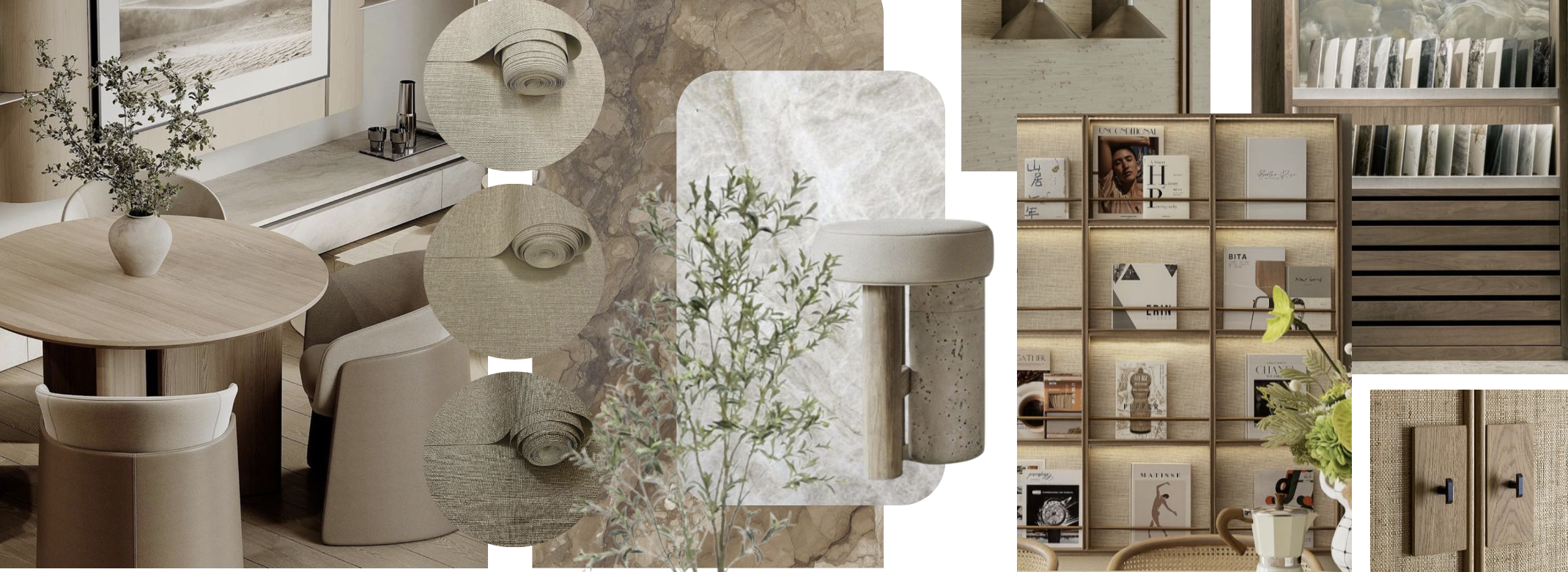 interior shot serene interior scene using a warm neutral palette of soft beige light taupe pale wood and muted grey tones emphasise natural textures and materials smooth timber honed stone brushed plaster and tactile woven fabrics the atmosphere should feel minimal organic and refined with a focus on tonal harmony and subtle material contrast incorporate gentle lighting that highlights the grain weave and natural variation of surfaces the overall composition should evoke a sense of earthy calm quiet luxury and timeless balance where texture and tone define the space rather than decoration