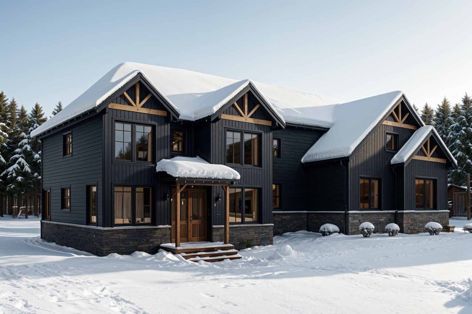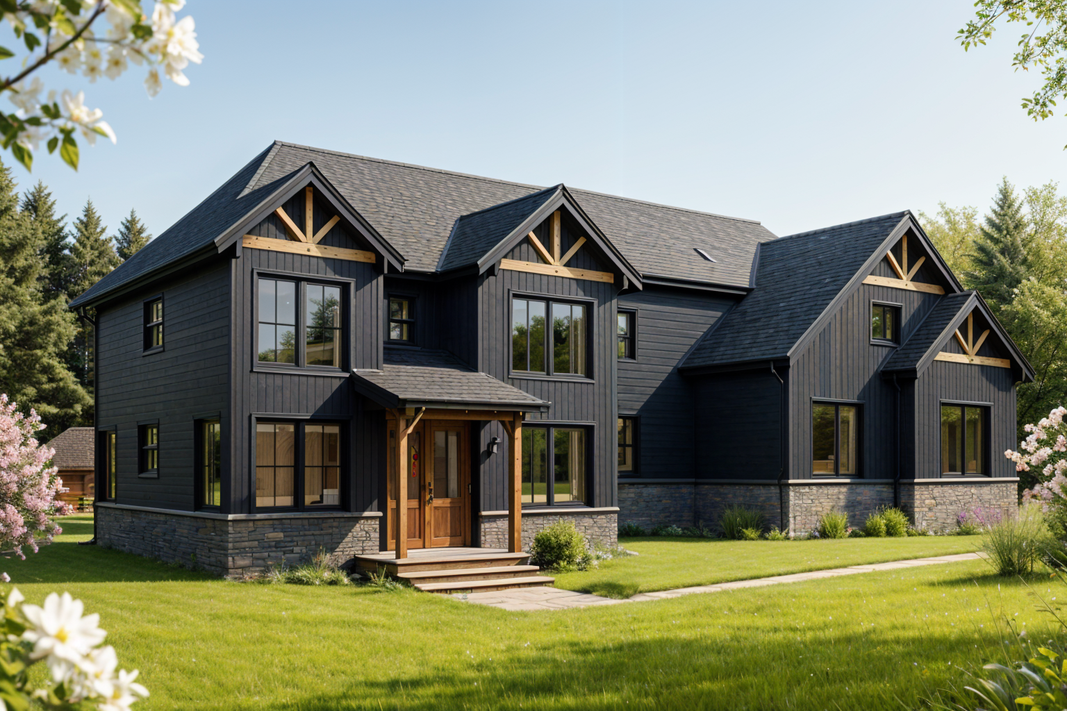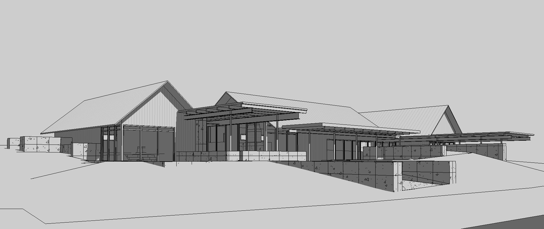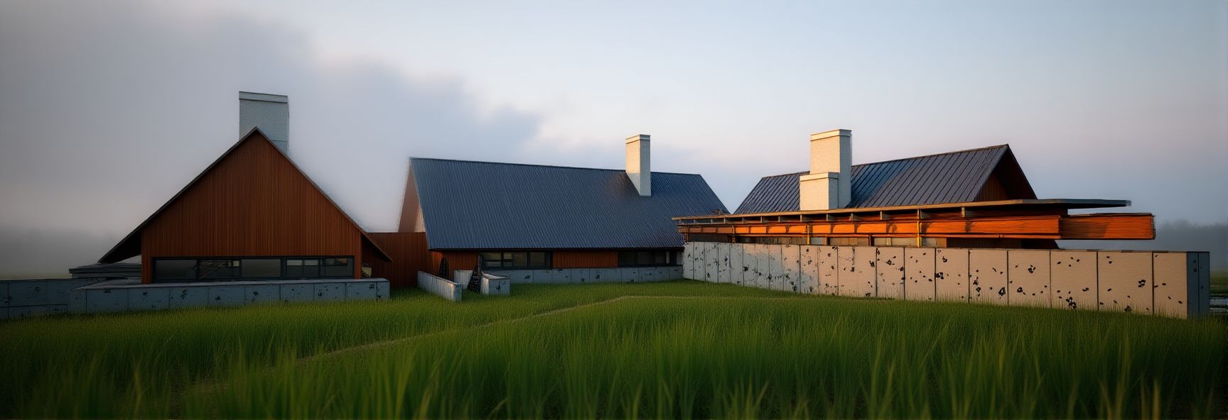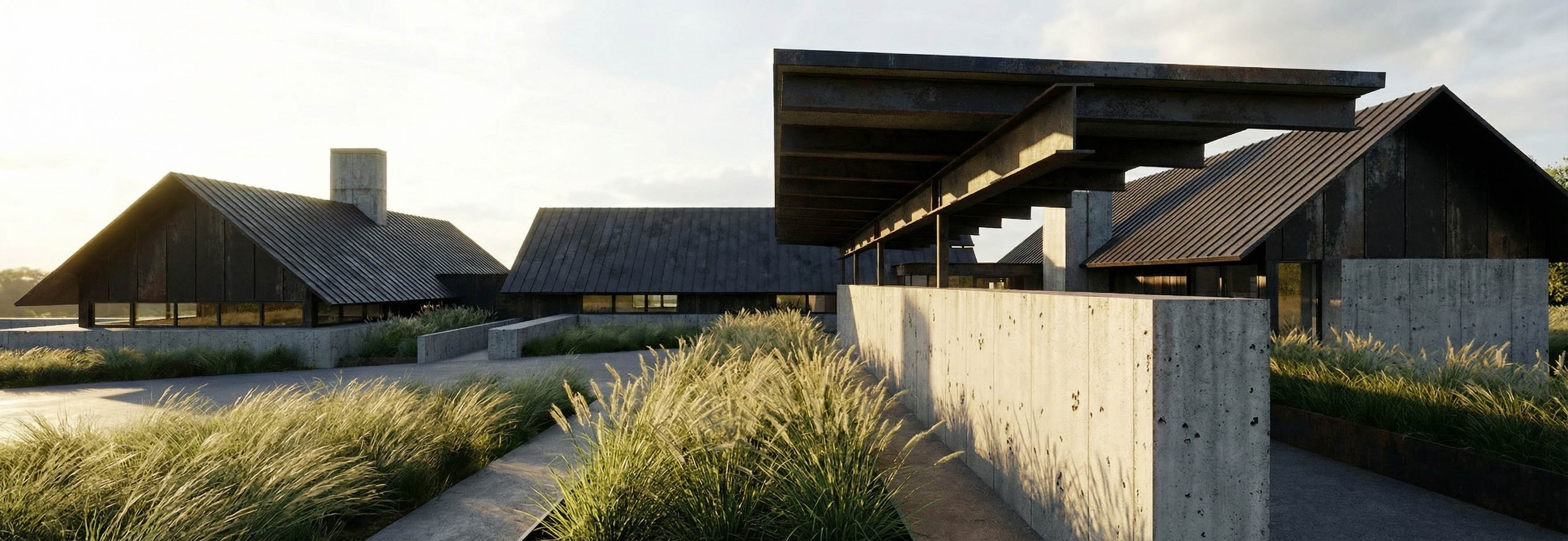 corten steel panels rustic wood shiplap siding concrete accent walls sunlight on building face tall grass in foreground fog trees in background matte black car