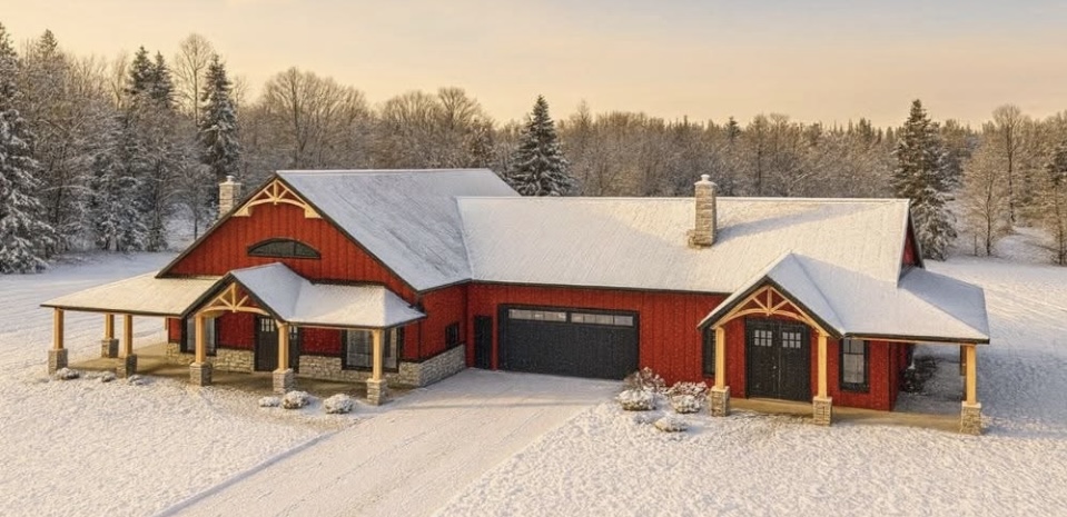 modernist exterior shot remove the snow and make it summer make it dusk make the roo f black steel make the siding daark green steel make the garage door wood add trees and landscaping add a driveway architecture
