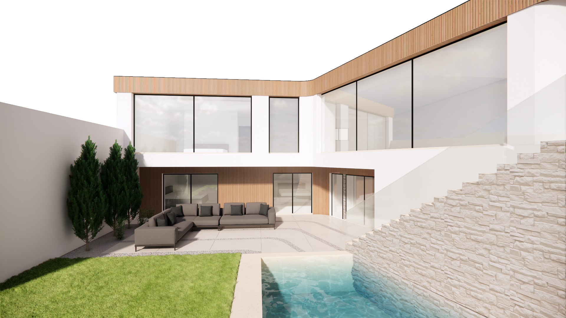 this is an outdoor scene the viewer is standing in the garden looking toward the exterior fa ade of the building do not change the architecture geometry proportions camera angle or composition do not alter any materials of the building including plaster wood stone glass or metal do not change the exterior environment vegetation type furniture pool or any landscaping elements do not modify colors design layout or textures absolutely no redesigns or replacements of any kind only enhance the atmosphere outdoor lighting and realism of the existing image improve natural daylight add subtle shadows soft reflections realistic sky lighting and refined depth without changing the scene itself everything must remain exactly as in the original image except for improved lighting mood and realism keep the small black stripe on top of the roof