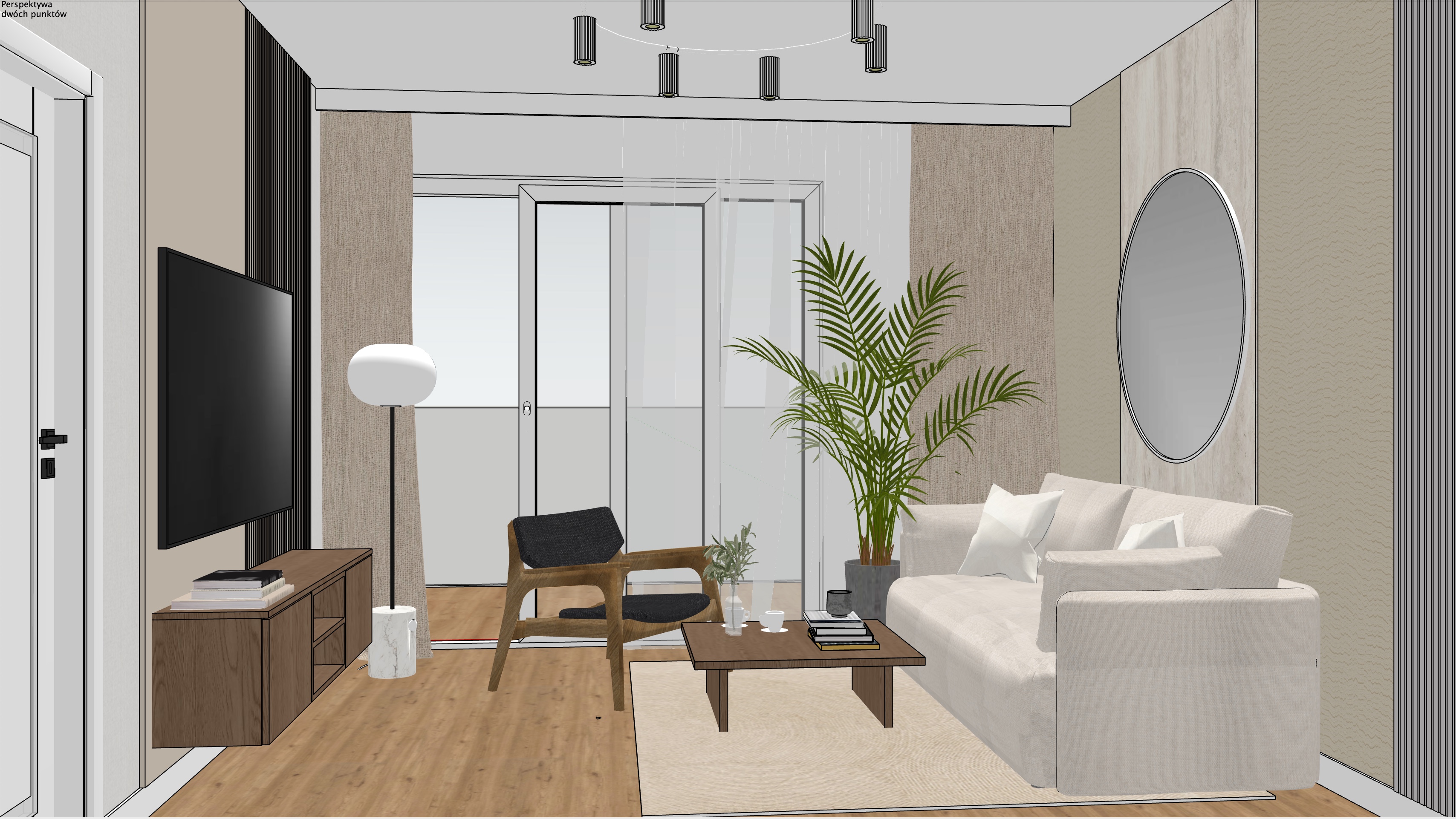 photorealistic interior visualization of a cozy elegant living room with soft beige and warm tones large floor to ceiling windows opening to a balcony with a modern glass railing outside a beautiful natural view with trees in the foreground and a lake visible farther in the distance not directly next to the building bright yet soft daylight calm and inviting atmosphere refined contemporary design high end materials subtle textures stylish furniture natural fabrics wooden accents realistic proportions ultra detailed cinematic light realistic shadows premium interior magazine style