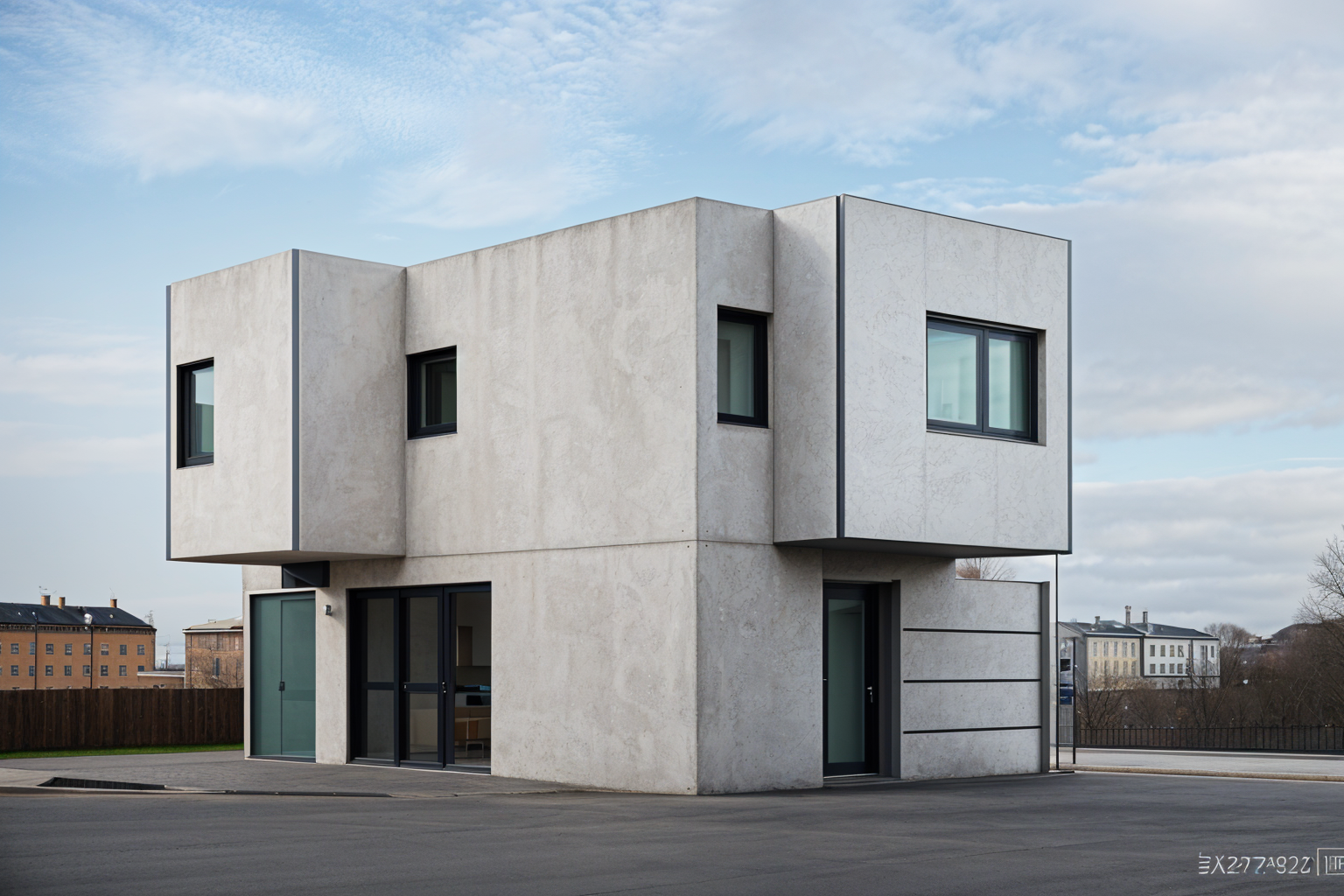 postmodern exterior shot post modern building with gray smooth stucco and black window frames architecture