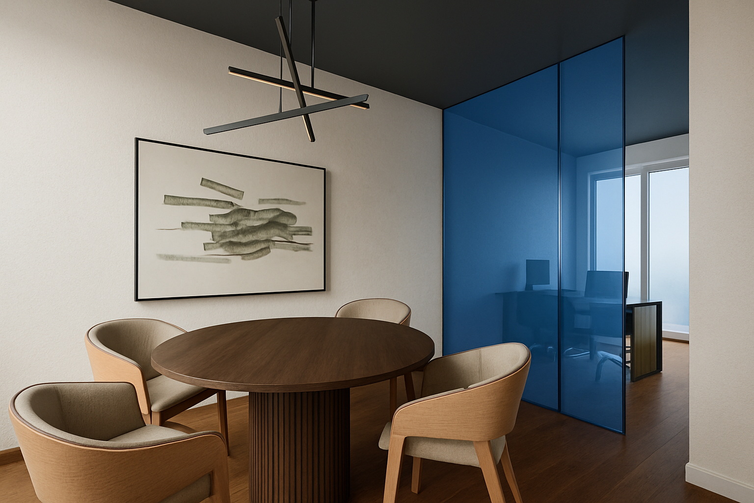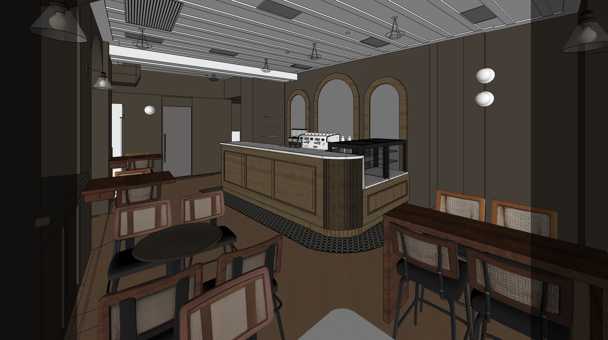 transform the provided coffe bar interior image into a high end photorealistic render with warm golden hour atmosphere soft glowing highlights and relaxed upscale coastal energy while keeping everything exactly the same same proportions same bar shape same booth seating same ceiling same brown plaster wall finishes same curtains same materials and same spatial configuration do not move or alter any objects geometry textures colors or furniture positions the chairs throughout the restaurant must remain exactly in the same locations and proportions but their materials should read realistically chairs should appear upholstered in soft reddish black leather fabric with subtle natural tone but upholstere with a matte plush surface and gentle directional nap while keeping their black metallic shapes frames and positions unchanged add premium table settings including coffee glass and a cake on plate while keeping all tables and chairs in their exact positions include modern young guests standing at the bar and at selected tables casually social correctly scaled tastefully integrated without crowding or obstructing architectural details add two bartenders behind the bar preparing drinks and interacting naturally while preserving the bar s structure and alignment the display counter must clearly appear filled with cake and sweet with cool reflections moisture and texture while keeping its exact position and shape unchanged on the bar shelves add wine bottles and premium alcohol bottles arranged tastefully and evenly while keeping the shelving structure unchanged the shelving should feature warm and bright accent lighting enhancing reflections and bottle silhouettes the wall behind the bar shelves must clearly appear as amber glass in a deeper richer golden amber tone with a ribbed textured surface and illuminated from behind with warm vivid backlighting while maintaining its exact geometry proportions framing and alignment lighting should emphasize golden hour warmth gentle reflections soft shadows enhanced color richness and luxurious catalog level realism improve depth and realism through wood grain richness marble shine brass highlights fabric texture and polished clarity while keeping the entire scene exactly as originally designed