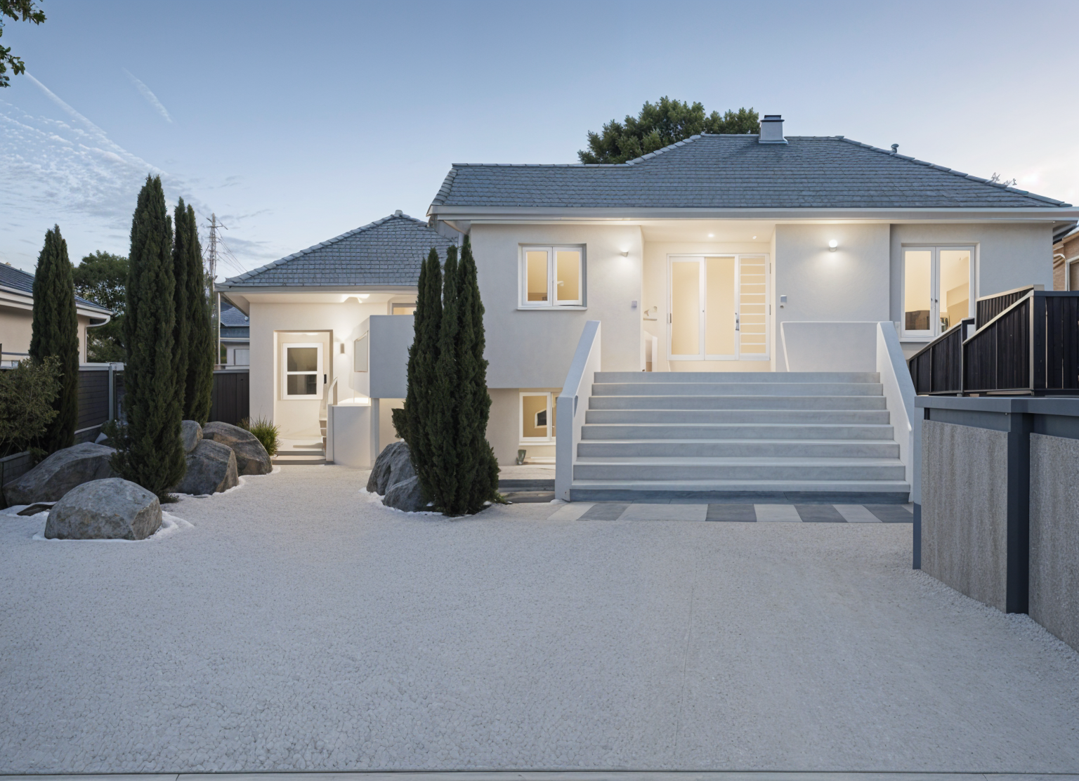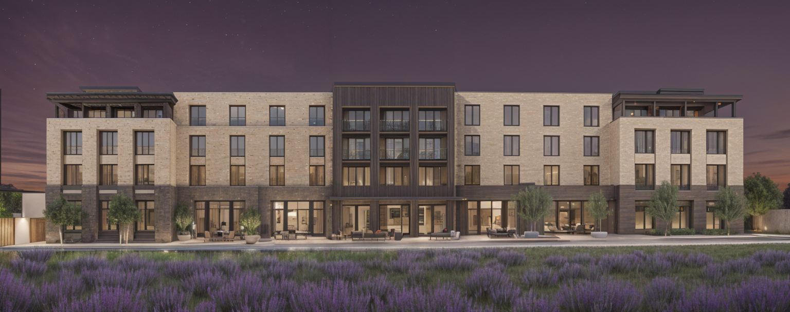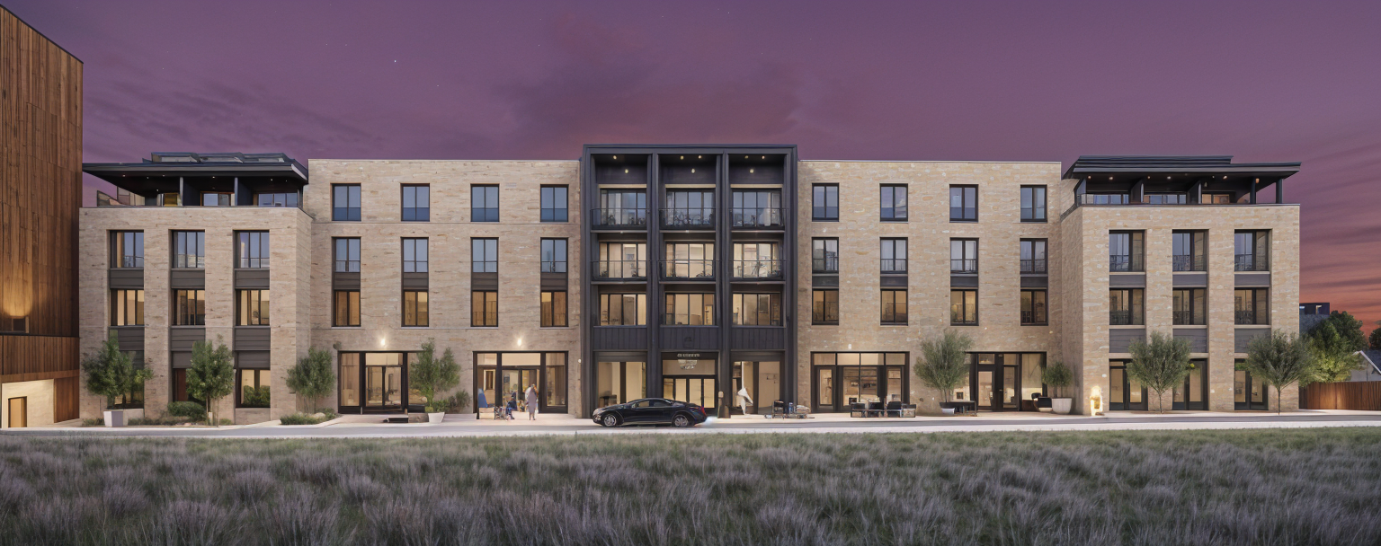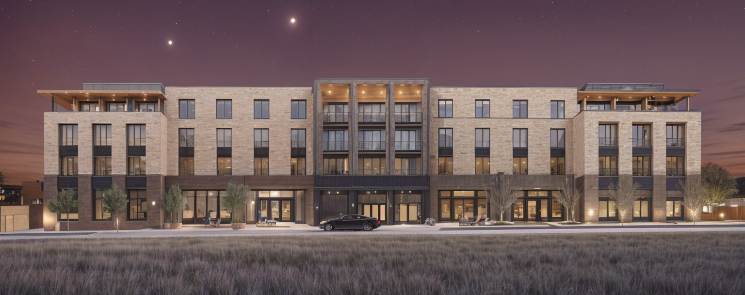 a industrial hotel in fort worth texas plaster and stone walls steel framed windows strong geometric forms rooftop terraces with greenery symmetrical fa ade and dramatic nighttime architectural lighting western traditional design architecture