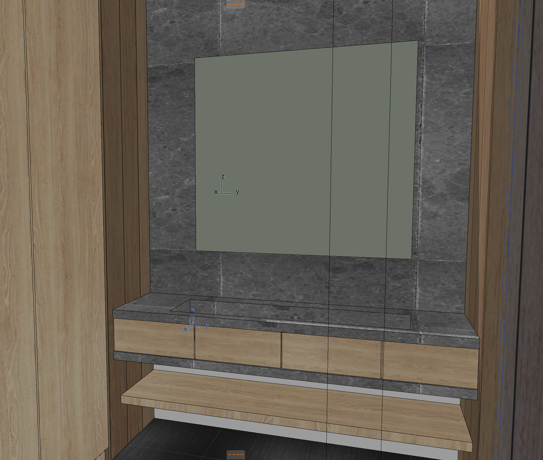 medium black stone countertop with medium veiling white oak cabinets and drawers black ribbon floor tile white sheep skin rug on floor wall material to be white oak vertical boards