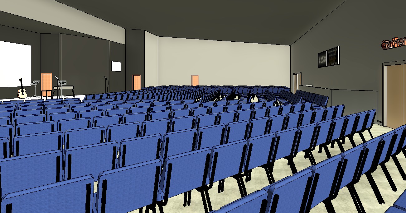industrial style church lobby with bistro tables and chairs brick wall on the left concrete floors white ceiling medium gray walls one church logo on the brickw all in black and orange paint