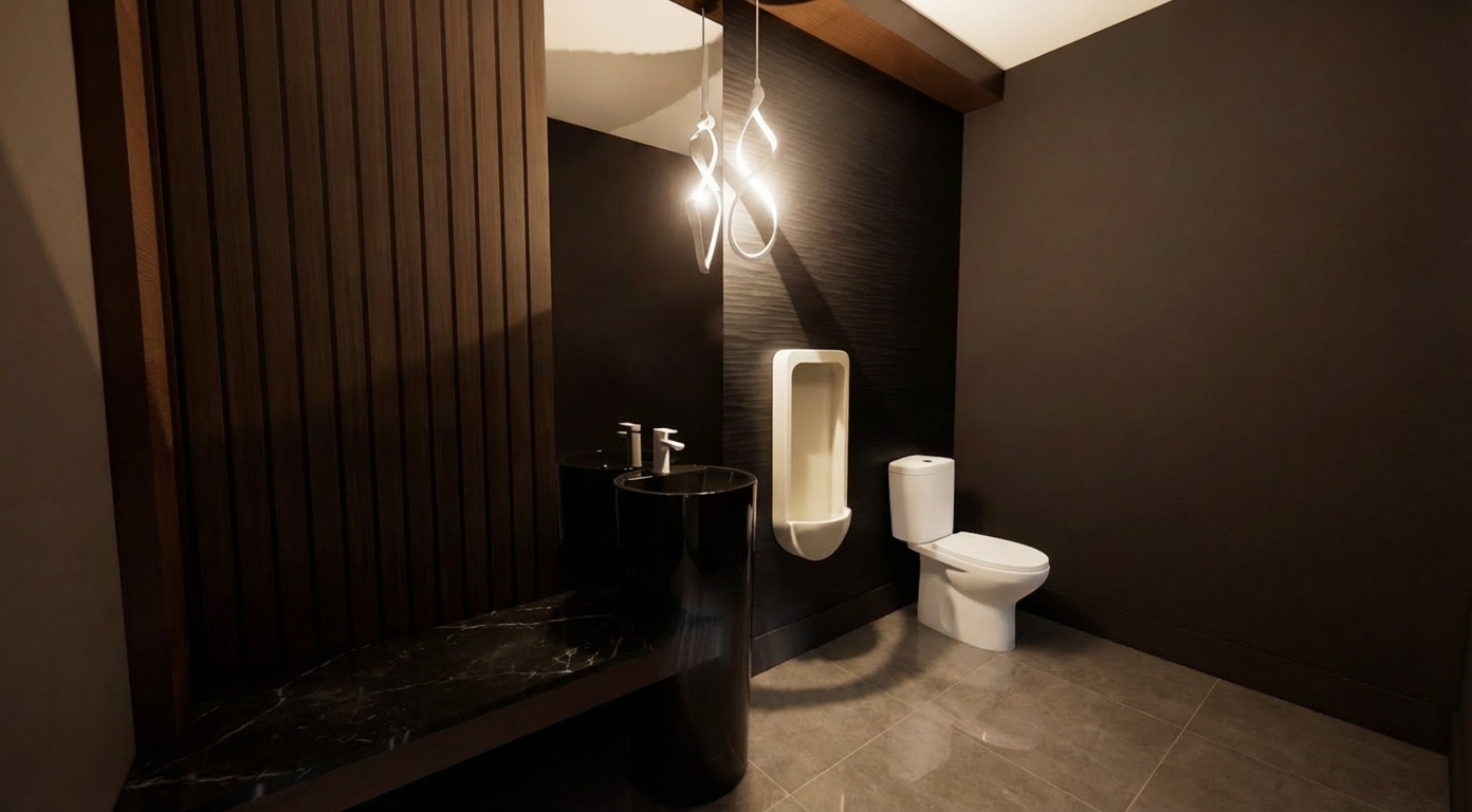 brighten the room slightly and add 3 hooks to the slat wall with 1 white robe hanging on one and 2 rolled towels on the bench