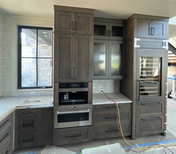 do not change the cabinets in any way preserve the exact cabinet colors materials finishes dimensions door and drawer styles hardware spacing alignment and all geometry exactly as shown do not alter the countertop shape backsplash appliances flooring lighting fixtures or wall structure only remove the construction materials clutter and mess from the scene clean the room and make it look finished and staged add a few simple tasteful home accessories appropriate for the style of the space but do not add or remove any furniture windows or architectural elements maintain the original lighting direction and realism enhance clarity and polish the photo while keeping the cabinetry and room design completely unchanged do not alter the lighting to keep the cabinet colors as they are in the image add a simple view out the window stage the countertops for a kitchen