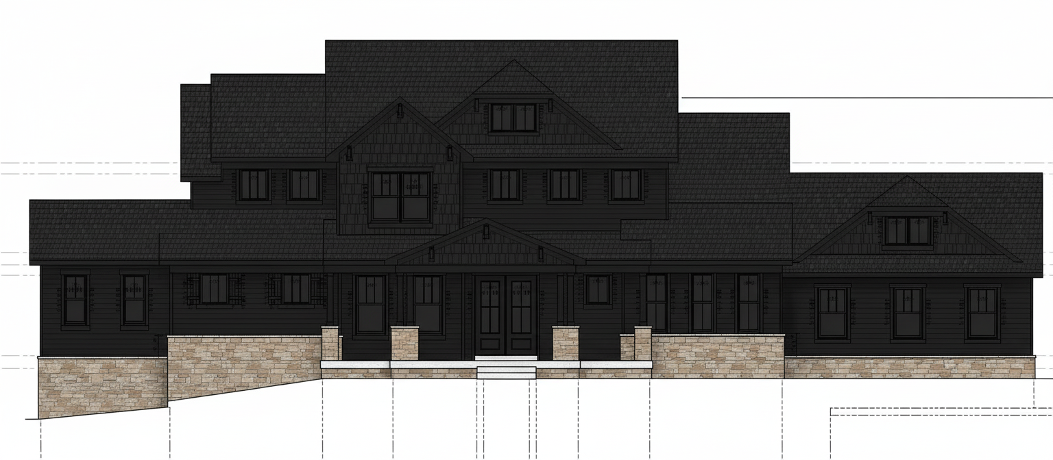 black house black windows lights brown stone