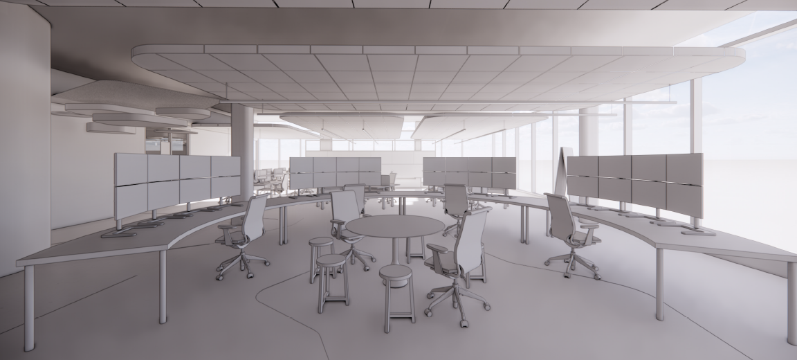 modern interior shot transform this interior white model clay render into a high end photorealistic architectural visualization of a contemporary corporate interior space for united airlines at san francisco international airport critical preserve all geometry exactly as modeled no changes to walls openings ceiling heights or layout maintain original camera angle composition and perspective do not add or remove architectural elements program identity space type premium airline lounge corporate workplace executive terminal environment reflect united airlines brand identity in a subtle sophisticated way not overt branding integrate aviation inspired design cues precision movement lightness efficiency convey a calm premium travel experience aligned with sfo s focus on wellness and sustainability materials light oak or warm engineered wood flooring matte neutral soft wall finishes off white warm gray microcement accents in united palette deep navy muted blue brushed aluminum stone elements limestone or light terrazzo for durability and elegance high performance commercial materials appropriate for airport environments lighting soft diffused daylight suggesting terminal glazing or perimeter exposure warm integrated lighting 3000k in ceilings coves and millwork even glare free illumination airport quality lighting design subtle contrast no harsh shadows furniture modern high end lounge and workplace furniture modular seating clusters integrated workstations and charging points ergonomic lounge chairs and banquettes materials leather wool high performance textiles in neutral tones with blue accents clean minimal forms consistent with premium airline lounges detailing integrated technology discreet screens flight information displays minimal not dominant refined millwork and joinery subtle wayfinding or graphic elements integrated into architecture minimal curated accessories no clutter environment exterior glimpses suggest airport context tarmac aircraft tails soft sky or abstracted runway lighting maintain focus on interior exterior should be soft and secondary render style photorealistic architectural visualization in the style of dbox mir luxigon cinematic but restrained editorial quality slight atmospheric depth soft reflections realistic material response mood calm sophisticated premium globally contemporary emphasis on comfort efficiency and quiet luxury avoid overly commercial glossy or branded look output ultra realistic competition level architectural rendering suitable for presentation architecture