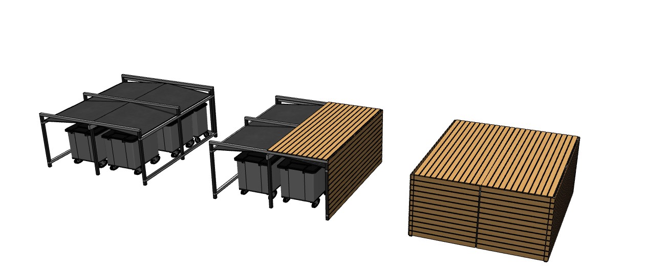 photorealistic architectural rendering of a modern modular trash enclosure black steel frame structure with horizontal wooden slats cladding multiple configurations open frame semi enclosed fully enclosed volume realistic garbage bins inside precise geometry clean orthographic perspective sharp edges accurate proportions natural daylight soft shadows kodak portra 400 film look subtle grain warm tones realistic materials matte metal natural wood texture high detail global illumination 50mm lens professional architectural photography minimal background studio white or urban environment modern outdoor trash enclosure in an urban environment black steel structure with wooden slat cladding integrated waste bins placed near residential building concrete ground soft daylight realistic shadows kodak portra 400 film style warm natural colors slight film grain ultra detailed textures precise geometry architectural photography 35mm lens no distortion straight vertical lines pbr materials ray tracing minimalist architectural visualization clean composition soft sky