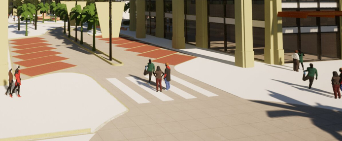street boulevard with car parking palm tree landscpaing beige stone tiles and a low speed road with cars architecture