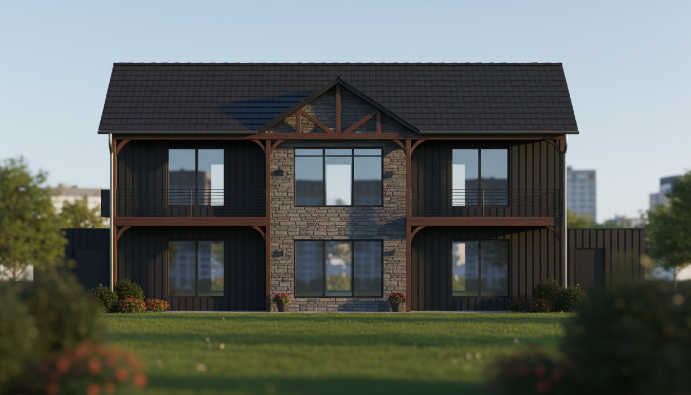 contemporary exterior shot black shingle roof black board and batten siding change brick to black siding windows are black and have grids architecture