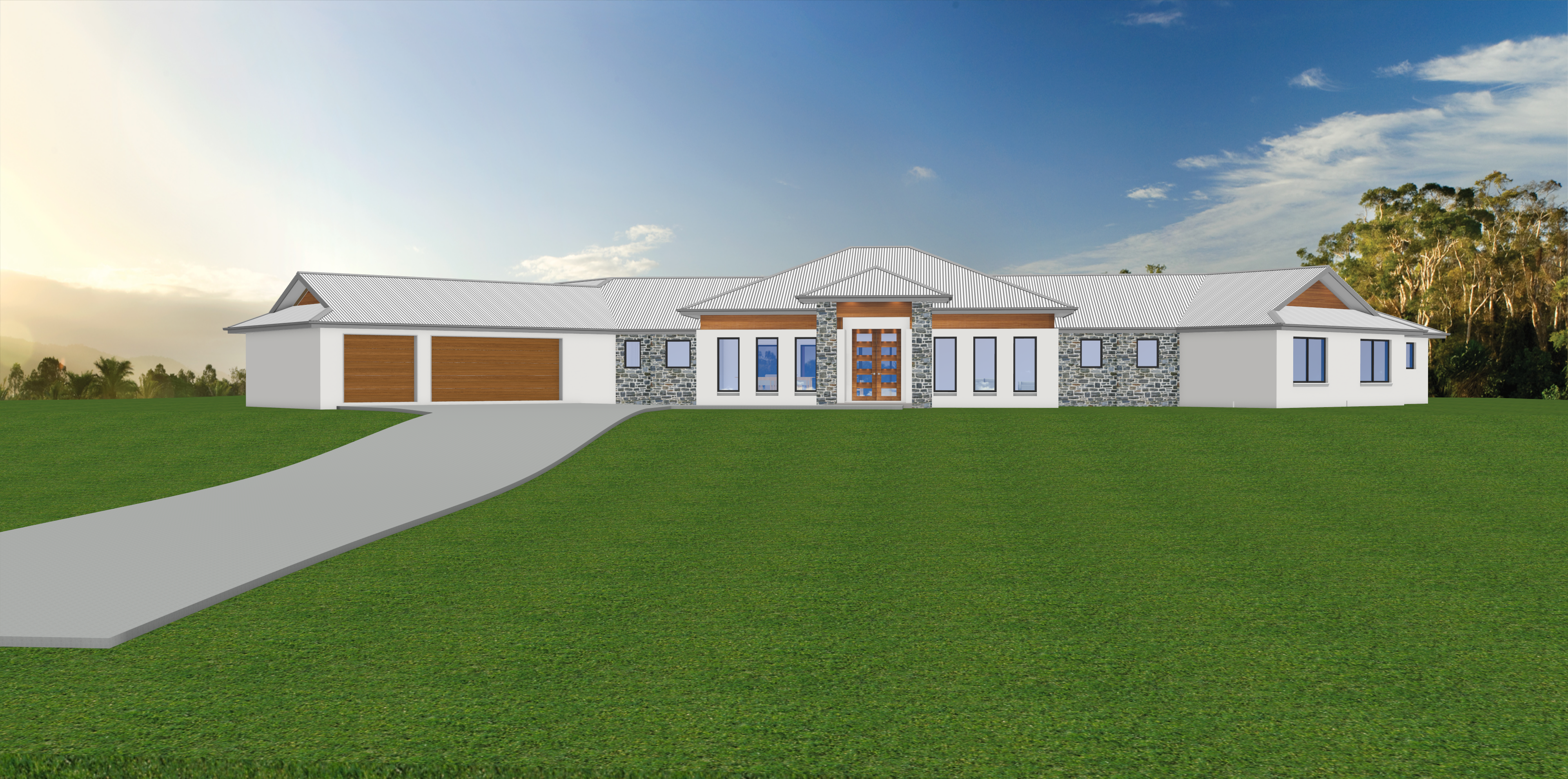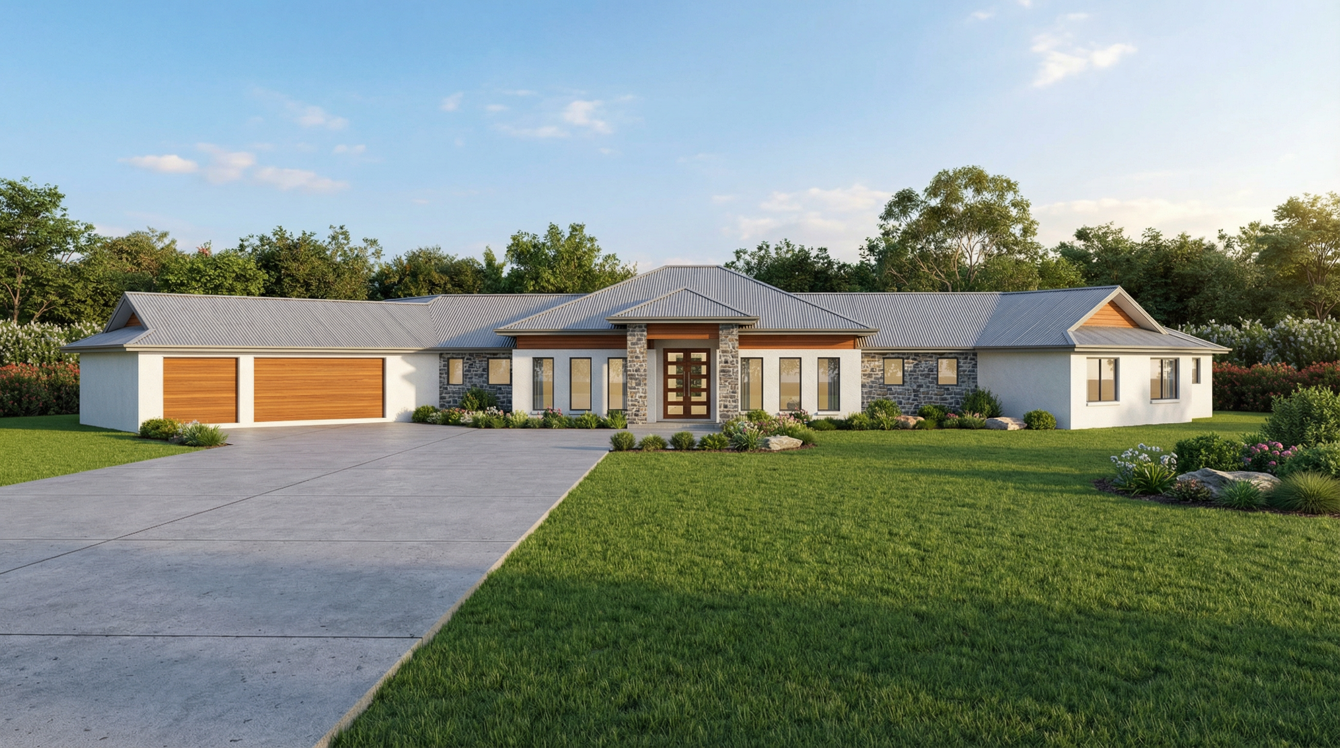 grass lawn to front with some feature landscaping bush backdrop semi reflective glass windows mid day light plain grey driveway