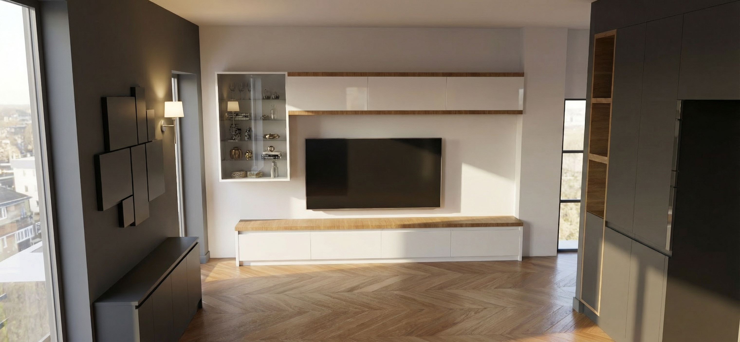 modern living room interior with a cozy and sophisticated atmosphere the room features a light beige sectional sofa with textured fabric positioned in front of a sleek minimalist tv mounted on the wall the walls are adorned with subtle vertical line patterns in shades of taupe and cream to the left a contemporary dining area includes a round white dining table with four matching chairs in a soft gray color large floor to ceiling windows allow natural light to flood the room creating a warm and inviting ambiance the floor is a herringbone patterned light oak wood enhancing the elegance hanging above the living area are sculptural pendant lights in matte white a touch of greenery is provided by a few potted plants infusing the space with freshness render with soft lighting to highlight the textures and create a serene inviting atmosphere
