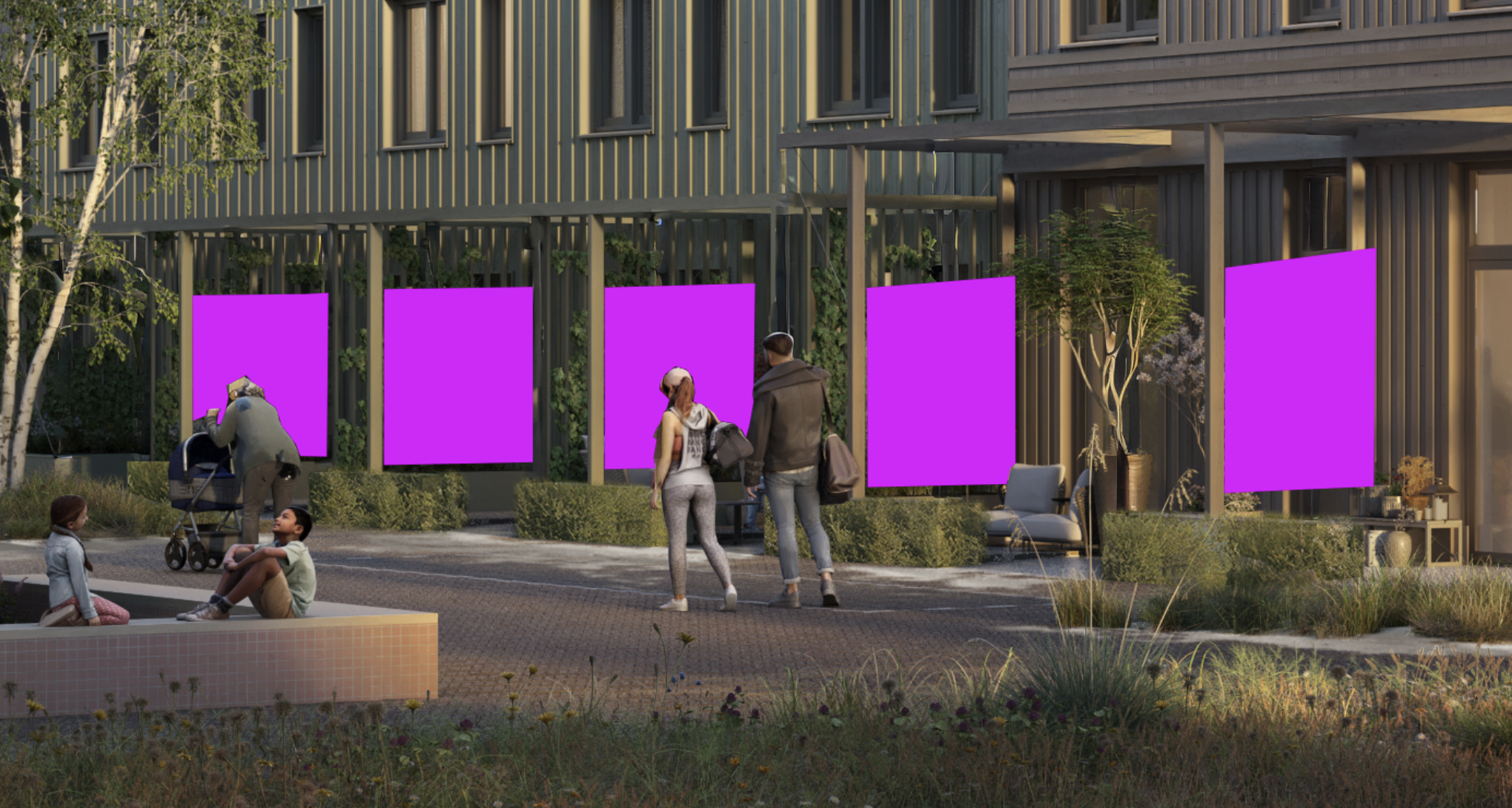 keep the lighting environment weather and time of day exactly as shown in the photo replace the pink colored area with a hedge privacy screen designed primarily as dense plant based partitions supported by wooden structural frames do not alter any other elements in the scene