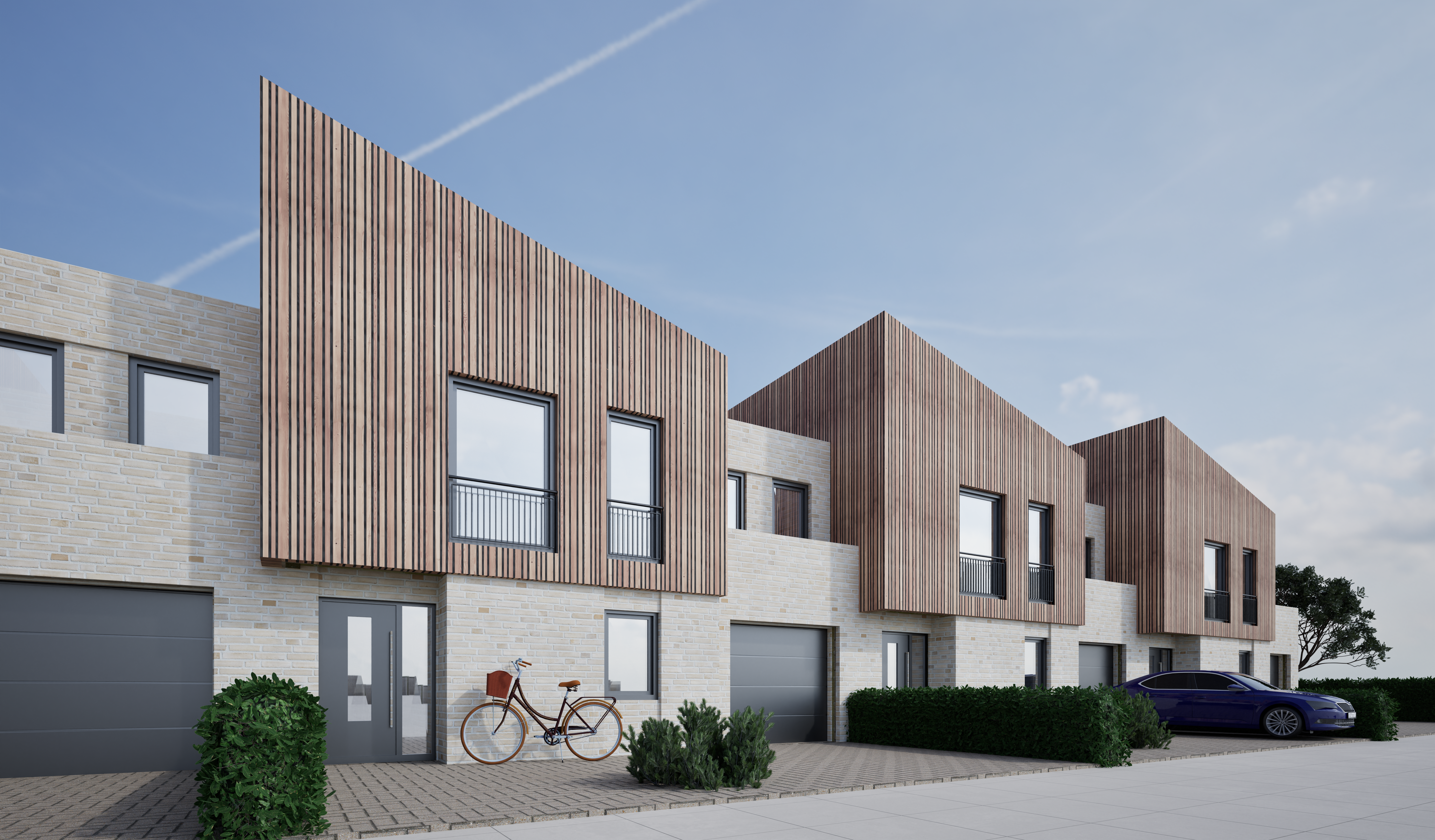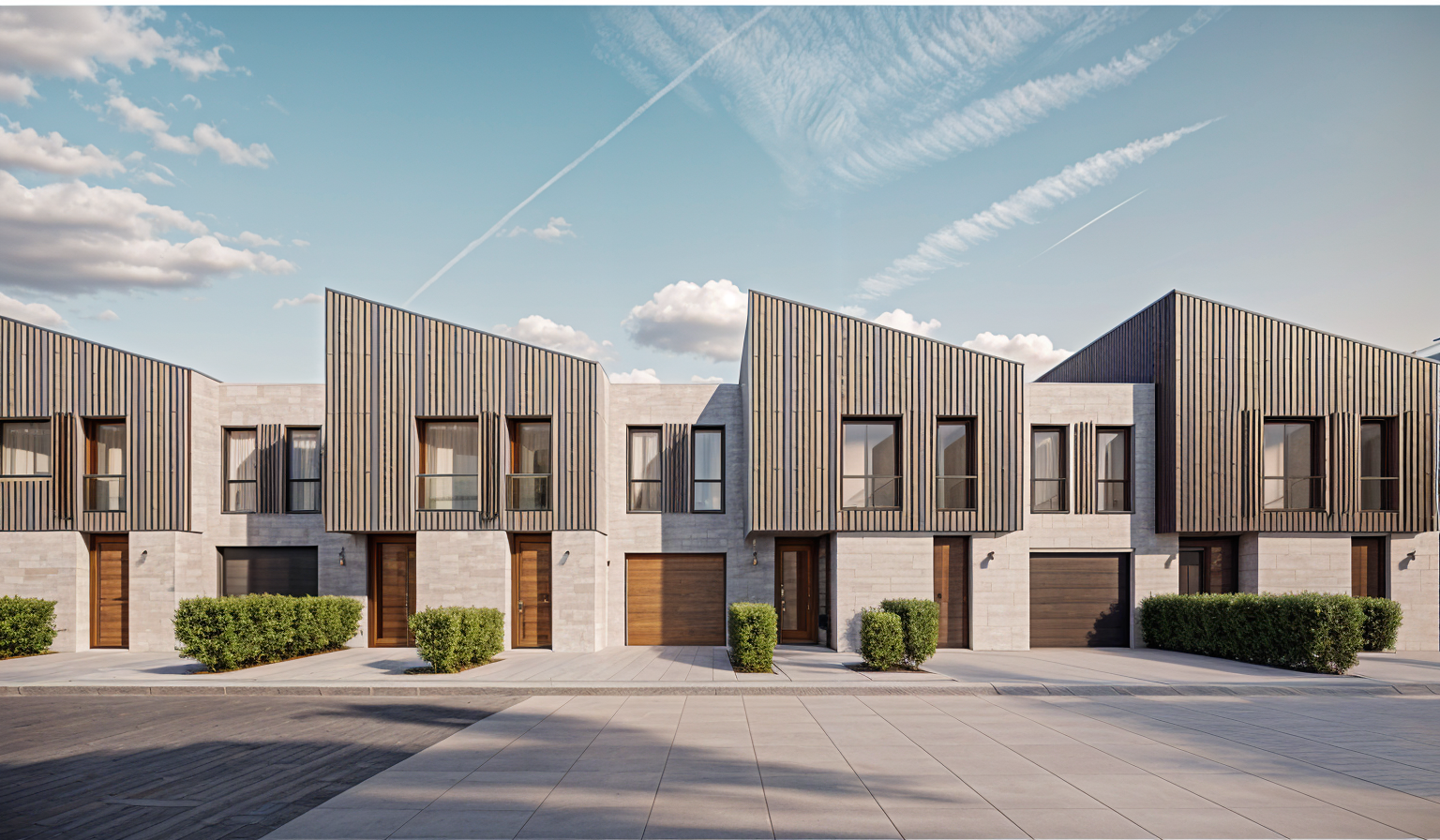modernistische au enaufnahme visualisieren sie ein modernes wohngeb ude mit einem zeitgem en design das geb ude sollte au enw nde aus holz und klinker haben gro e fenster mit reflektierendem glas und glatte schwarze akzente an den r ndern die atmosph re sollte hell und luftig sein mit klarem blauem himmel und sanftem sonnenlicht das sanfte schatten wirft die umliegende landschaft sollte ppiges gr nes gras bunt bl hende str ucher und hohe laubb ume mit herbstlichen bl ttern umfassen architektur architecture
