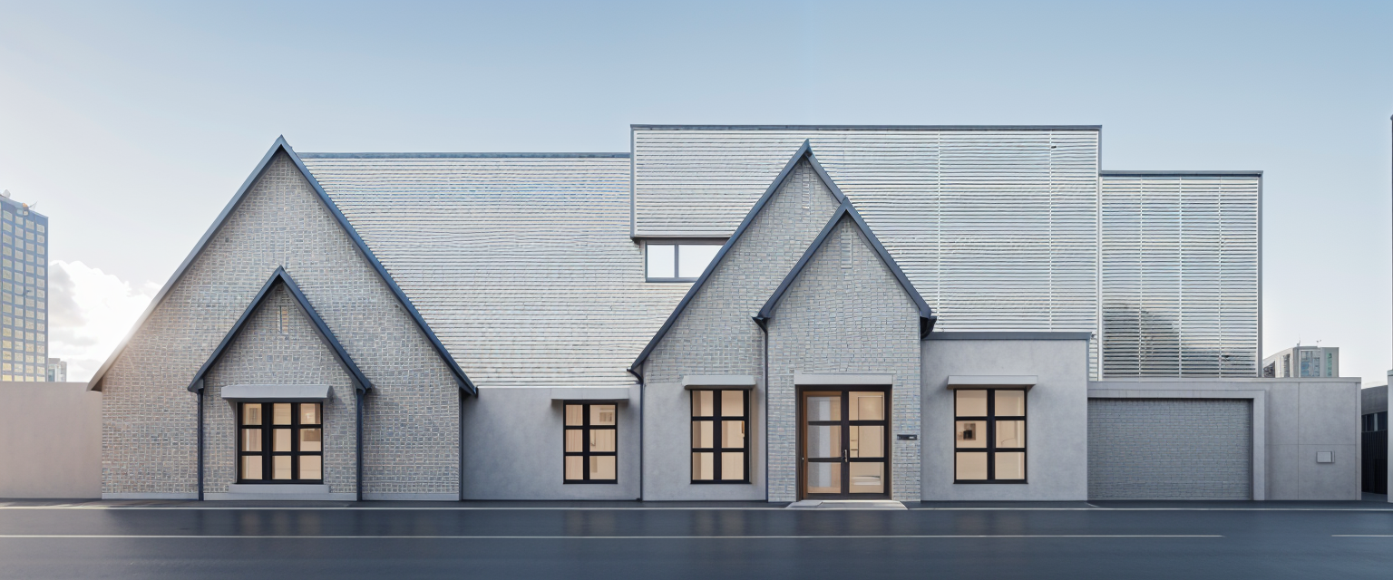 grainy watercolor rendering of house with black and medium tone warm wood siding surrounded by oak tree forest and leafy forrest floor dense forest background asphalt driveway where indicated architecture