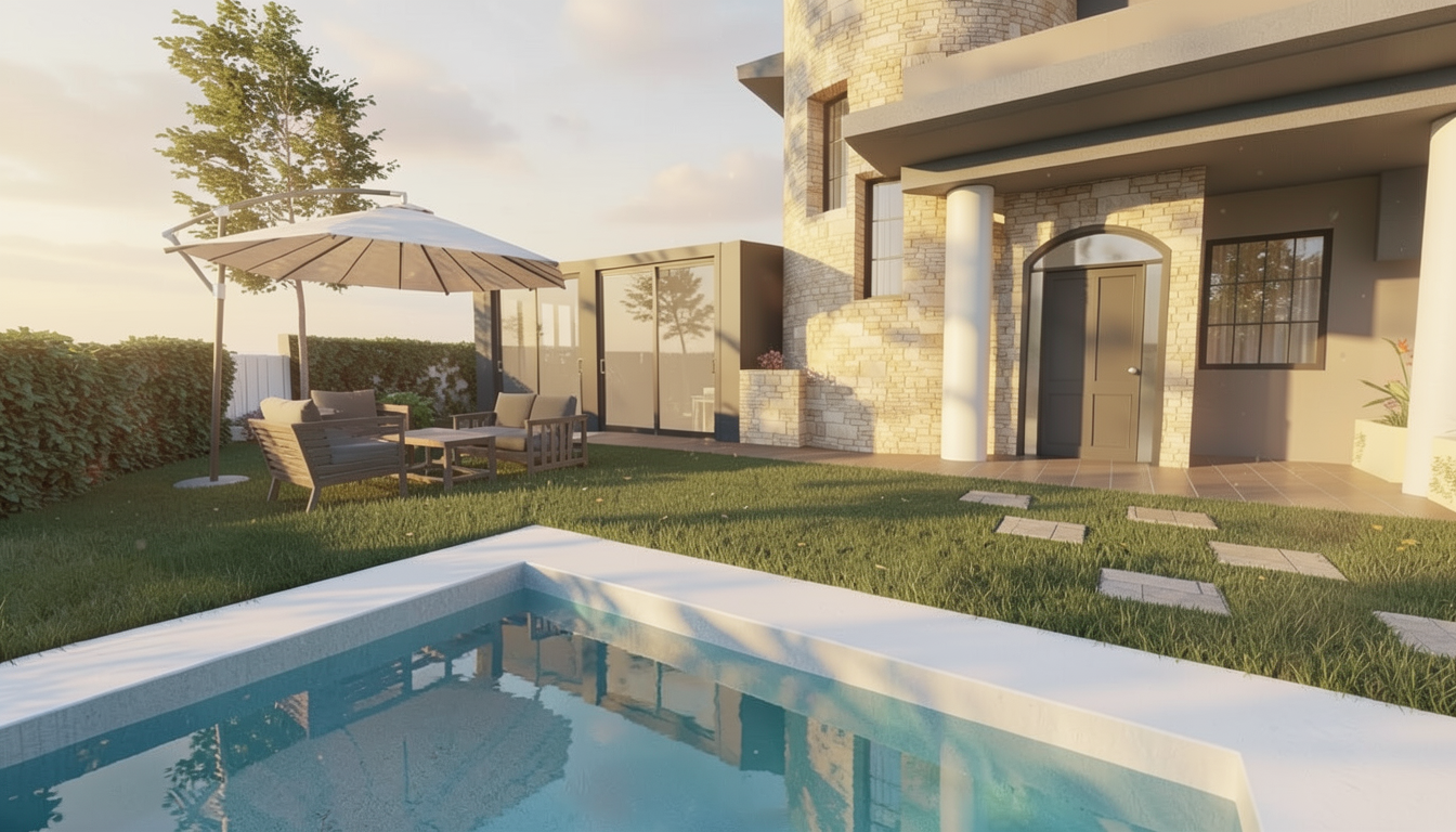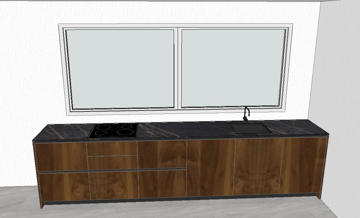 render a modern kitchen with a sleek design feature a dark marble countertop enhancing the luxurious feel the cabinetry should be crafted from rich walnut wood exhibiting a deep warm brown tone ensure the flooring is light gray providing a soft contrast to the darker elements include a large window with clear glass inviting natural light to create a bright and airy atmosphere the walls should be a clean crisp white contributing to a minimalist and elegant ambiance the faucet and stove should be in matte black adding a touch of modern sophistication overall aim for a contemporary and stylish kitchen space filled with natural light