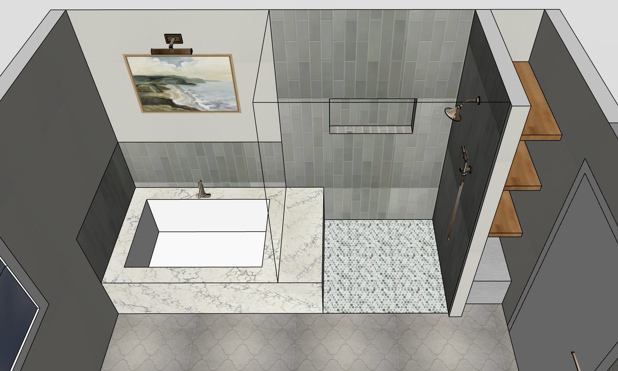 recreate this image to an ultra realistic photo of a zen master bathroom include natural sunlight pouring in from the window on the other left side of the room keep the colors exactly as they are