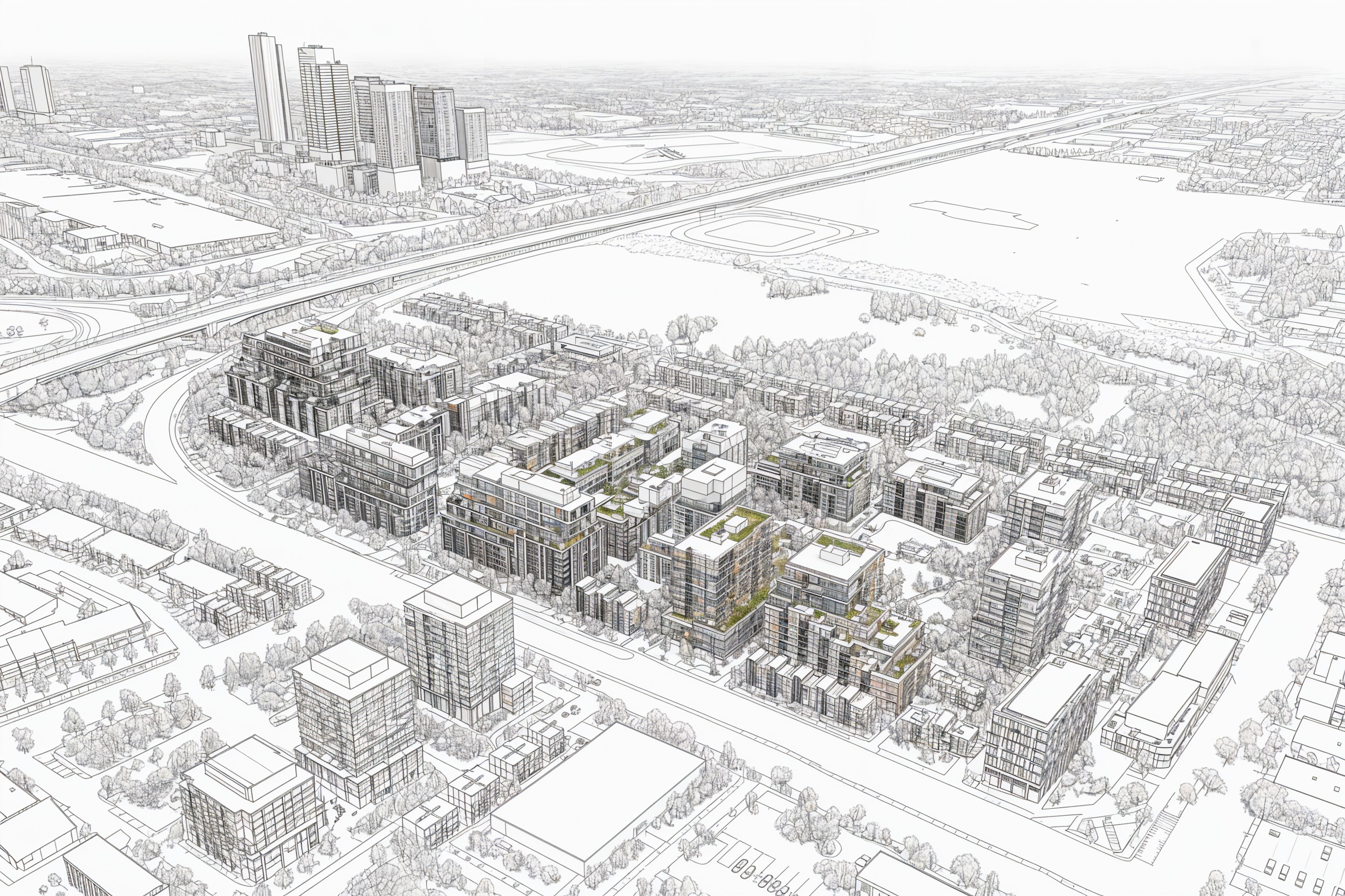 tadao ando exterior shot architectural illustration style for the main buildings in the site keep everything else white architecture
