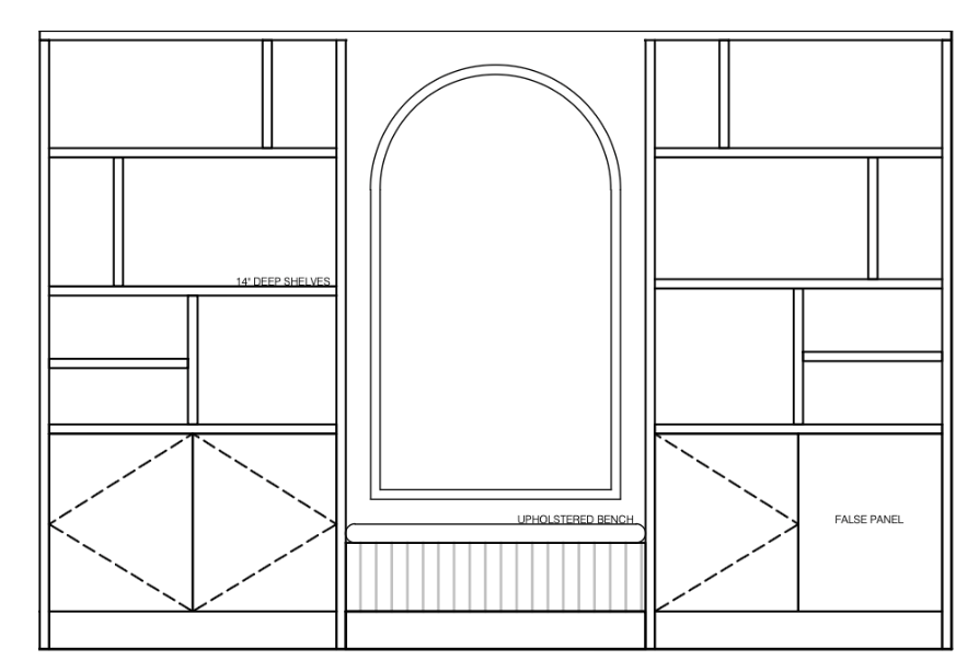 the millworker shelves make a midtown brown the bench is to be sherwin williams big dipper upholstered bench top in a neutral fabric add a central light just below the arch applied moulding with the wall sconce