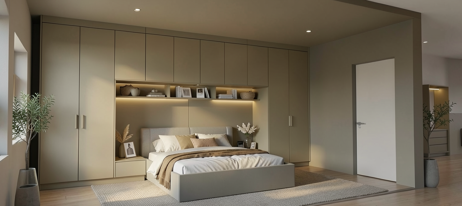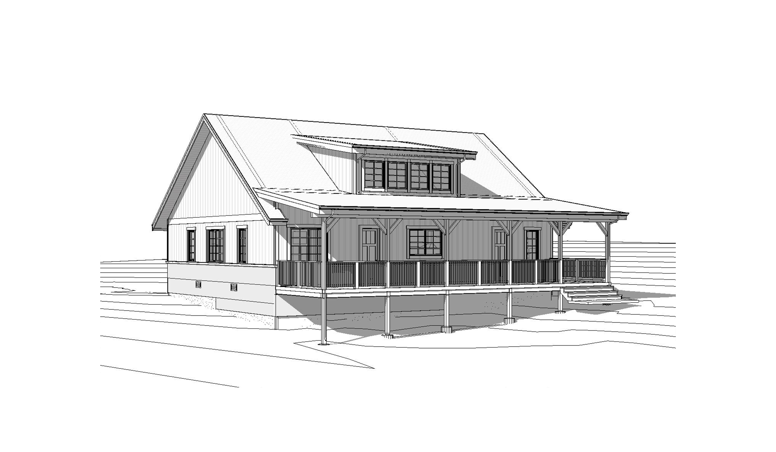 front view of a clean architectural exterior home rendered in cinematic golden hour lighting with bits of blue skies and sunlight coming through the clouds home in a coastal setting with faint streaks of light coming through trees in the surrounding area warm glow and coastal reflections off of the windows cloudy and stormy sky shining rustic select grade vertical wood siding green manicured landscape around structure with gardens and patches of grass black standing seam metal roof prominent trees in the background high fidelity photorealistic visualization crisp shadow falloff refined facade geometry soft atmospheric depth premium architectural photography mood ultra clean composition and materials black window trim flat roof small concrete path around the exterior of the home black trim around the windows photorealistic render