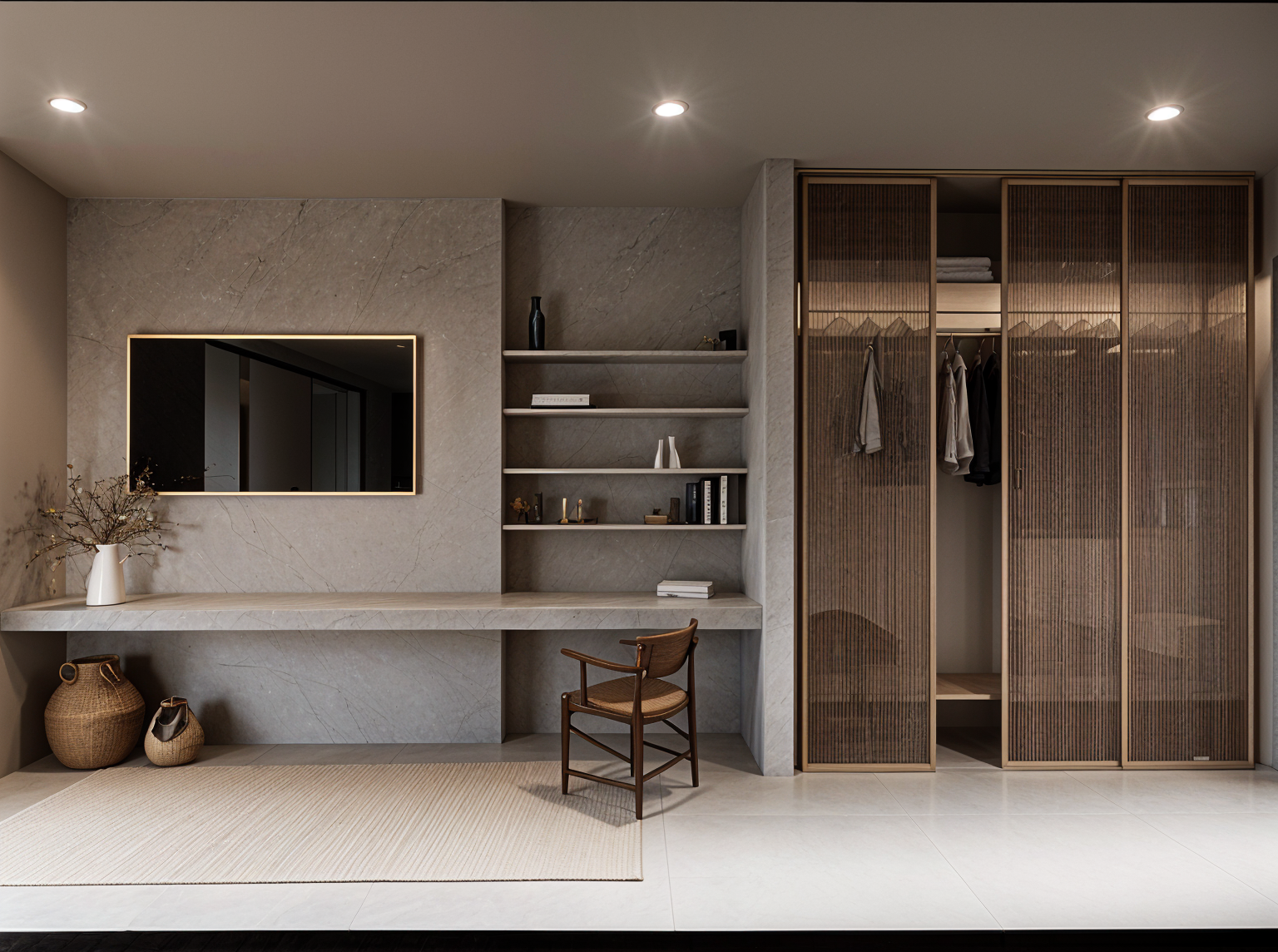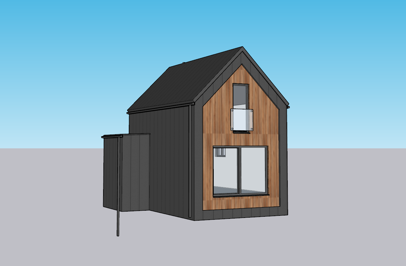 a manicured lawn layered flower beds low maintenance shrubs native plants concrete pathway beside big window dark metal roof realistic dark metal walls and natural wood