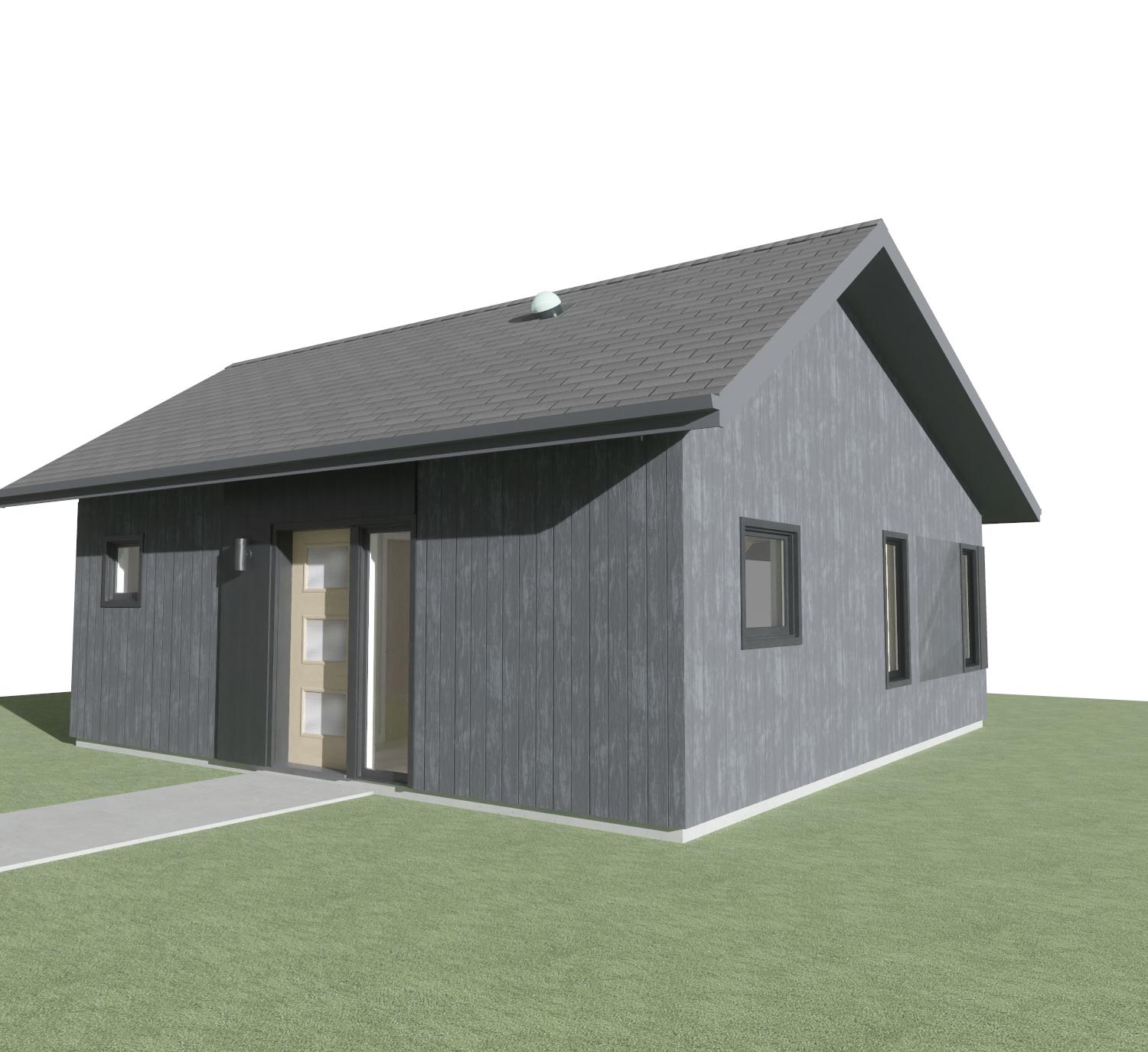 black and white line drawing architectural elevation style clean lines shading white background with trees and cloud include shrubbery around house