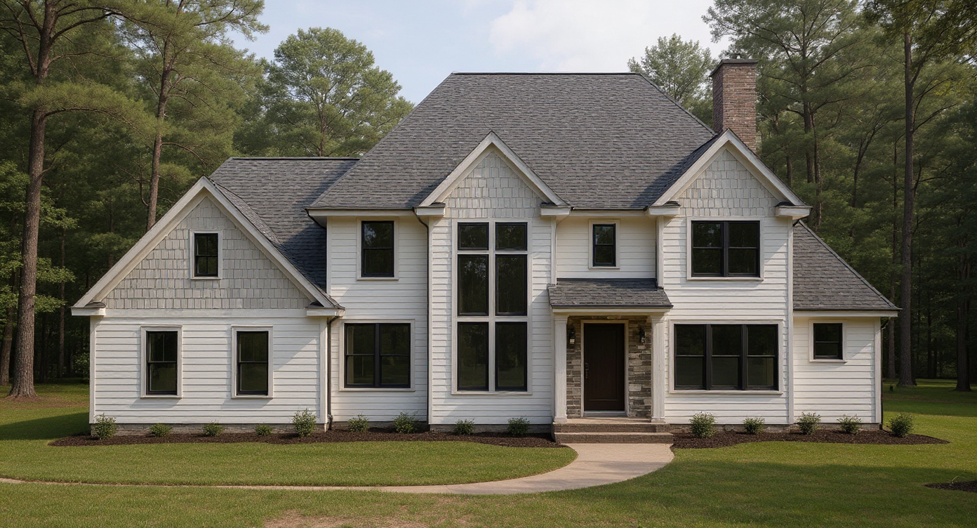 show clear blue skies with realistic dark wood finishing and smooth white render create a visual that looks inviting and landscaped with wild flower beds and a pathway leading to the entrance