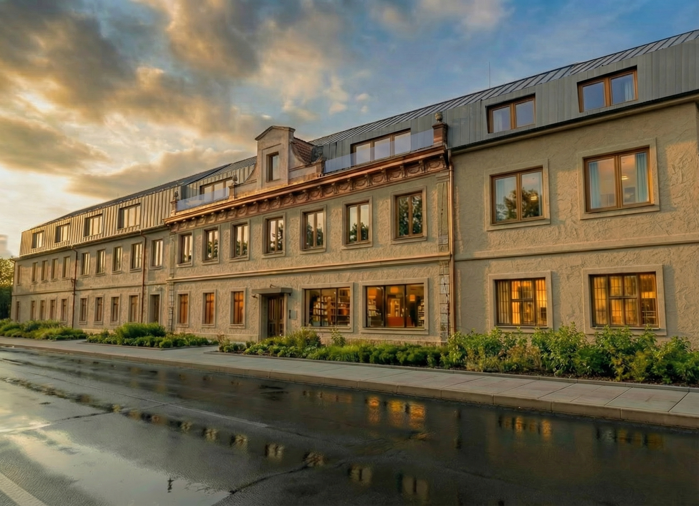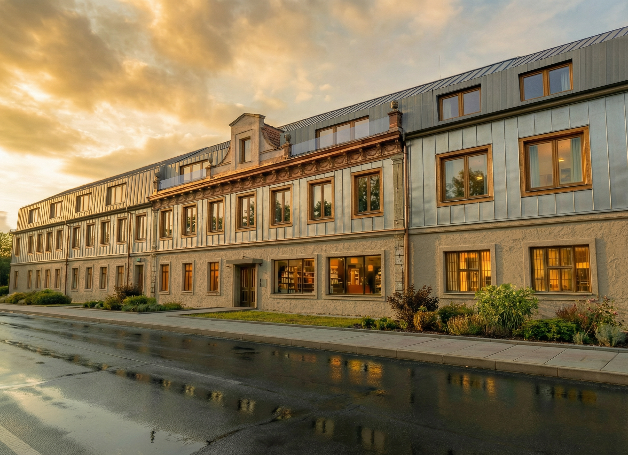 transform this image into a hyper photorealistic architectural visualization replace all non realistic materials with lifelike versions maintaining the dominant color palette add natural subtle sheen and glossy highlights on metals glass wood surfaces create realistic textures on concrete plaster and fabrics with micro details change background to serene lake region surrounded by dense forest enhance surrounding environment to ultra realistic quality while preserving exact structure and shape of bushes trees grass and lake detailed bark textures with moss on trees natural leafy density variation on shrubs short grass blades mixed with soil patches reflective lake surface with gentle ripples realistic water depth and shoreline details preserve natural forest floor under trees as woodland litter and earth leaf litter pine needles moss patches soft brown soil texture blending seamlessly add precise environmental reflections in every glass pane capturing surroundings bright high key lighting throughout with even daylight illumination no harsh shadows clear blue sky with soft clouds ultra detailed 8k photorealistic render professional architectural photography style