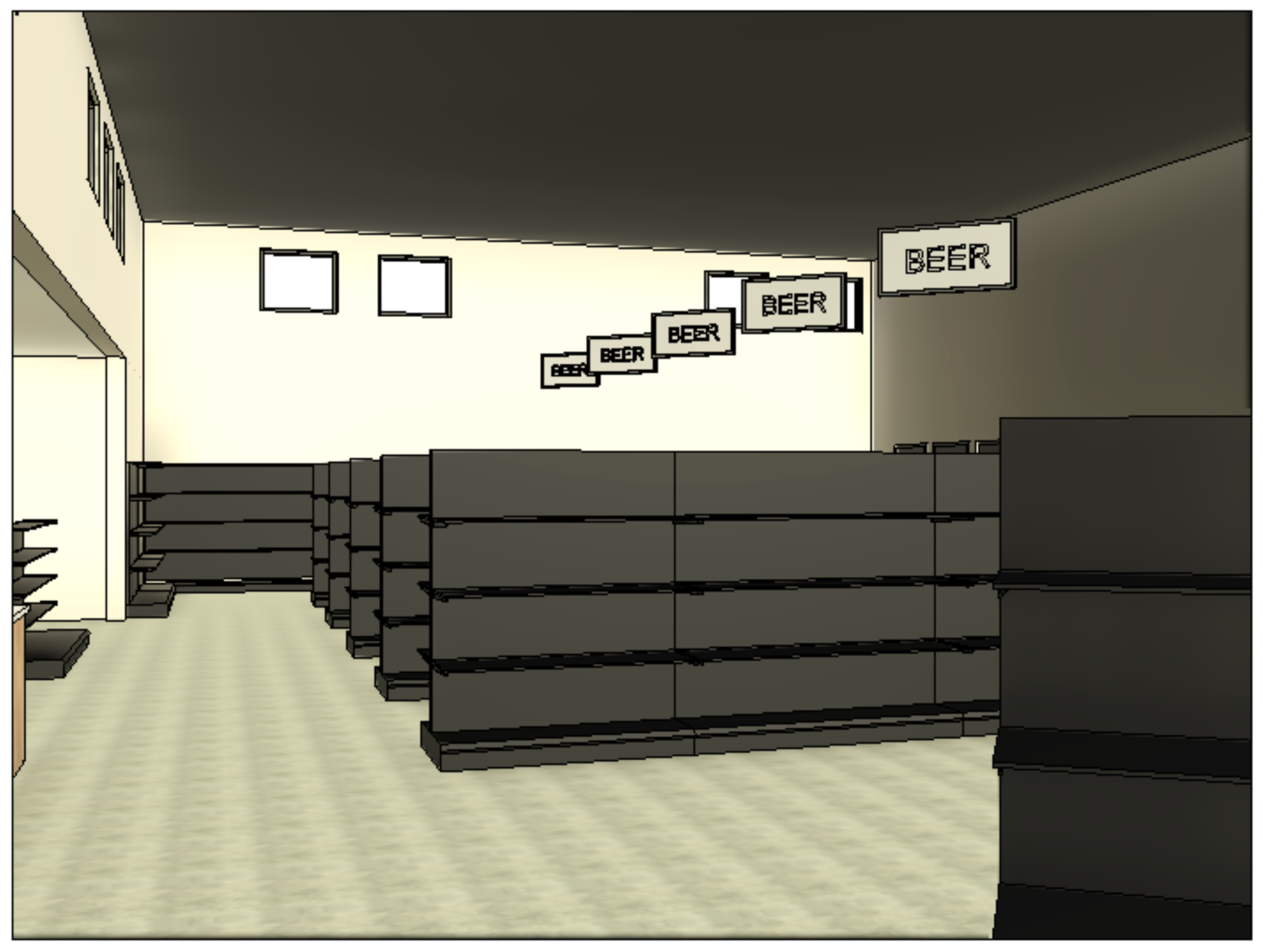 liquor store with sealed concrete floors with exposed structure black fixtures black and wood signage neon beer signs on walls